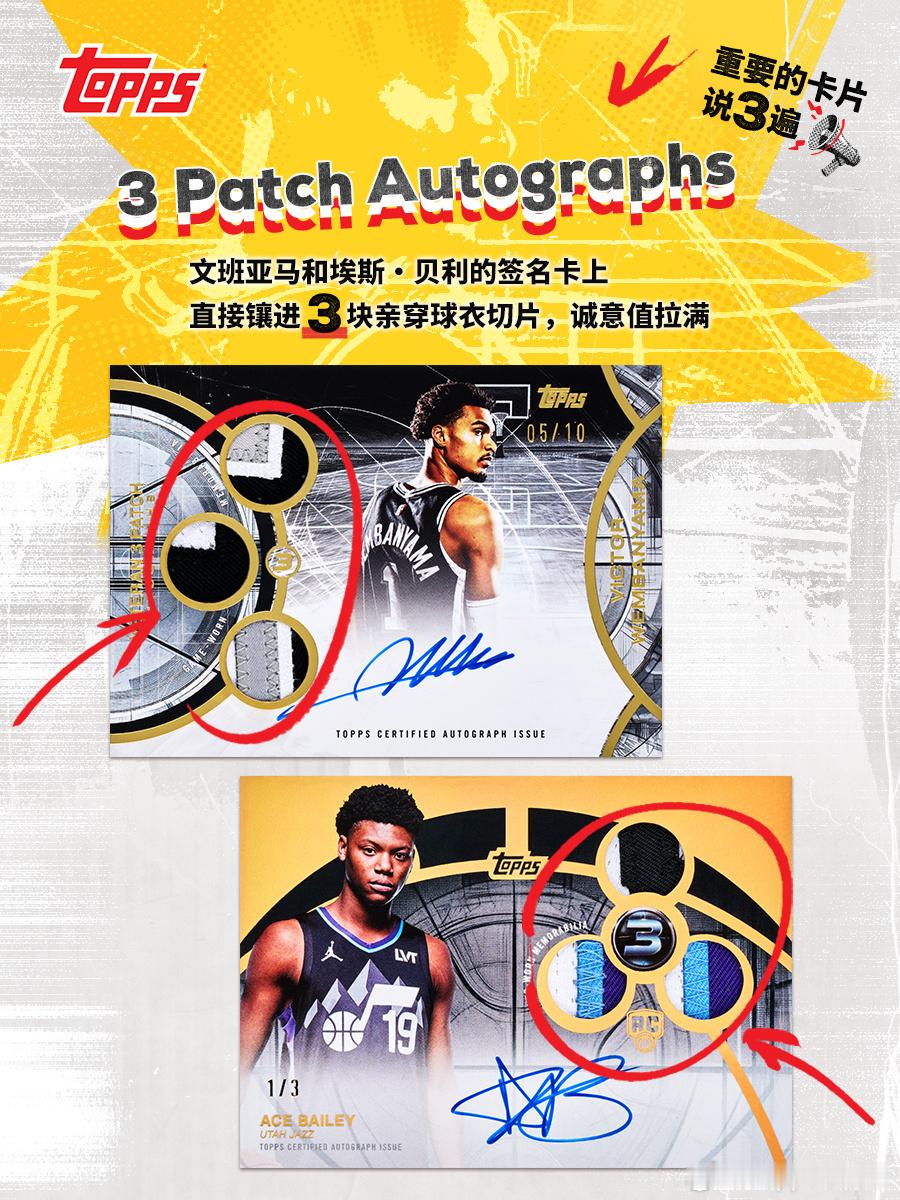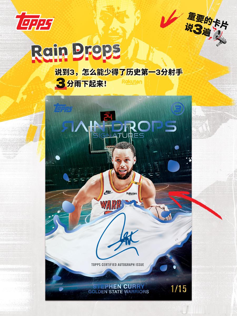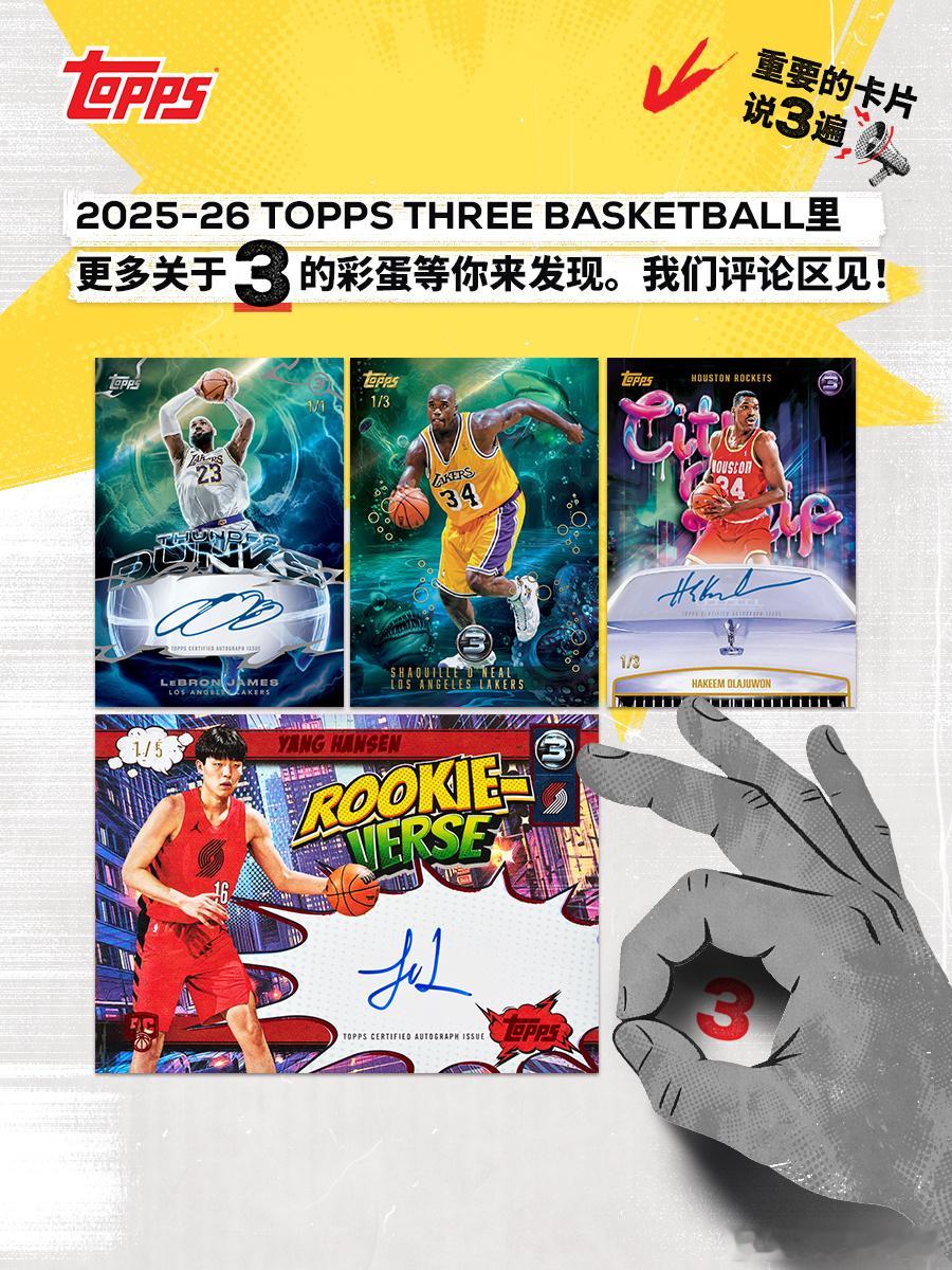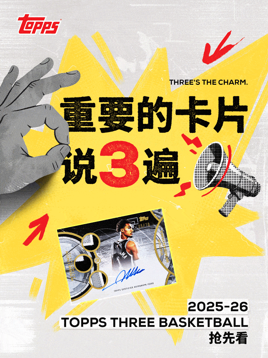 🔥 2025-26 Topps Three Basketball 强势回归💥 牌如其名,每盒内含3张亲笔签名或实物签名卡👇 但“3”的元素,可不止于此,让我们一起来盘一盘🔍 3 PATCH AUTOGRAPHS文班和埃斯·贝利的签名卡上直接镶进3块亲穿球衣切片,来带三重惊喜🔍 3&D3D球员怎么就不配拥有姓名了呢?康·克努佩尔场上润滑油,卡上也风流🔍 THE PAINT油漆区,又名3秒区,又怎么能少了SGA的身影?🔍 RAIN DROPS说到3,怎么能少得了历史第一三分射手库里呢?3分雨下起来!大家还在系列里发现了哪些隐藏的“3”元素?评论区等你来秀!🔍球星卡ToppsNBA篮球