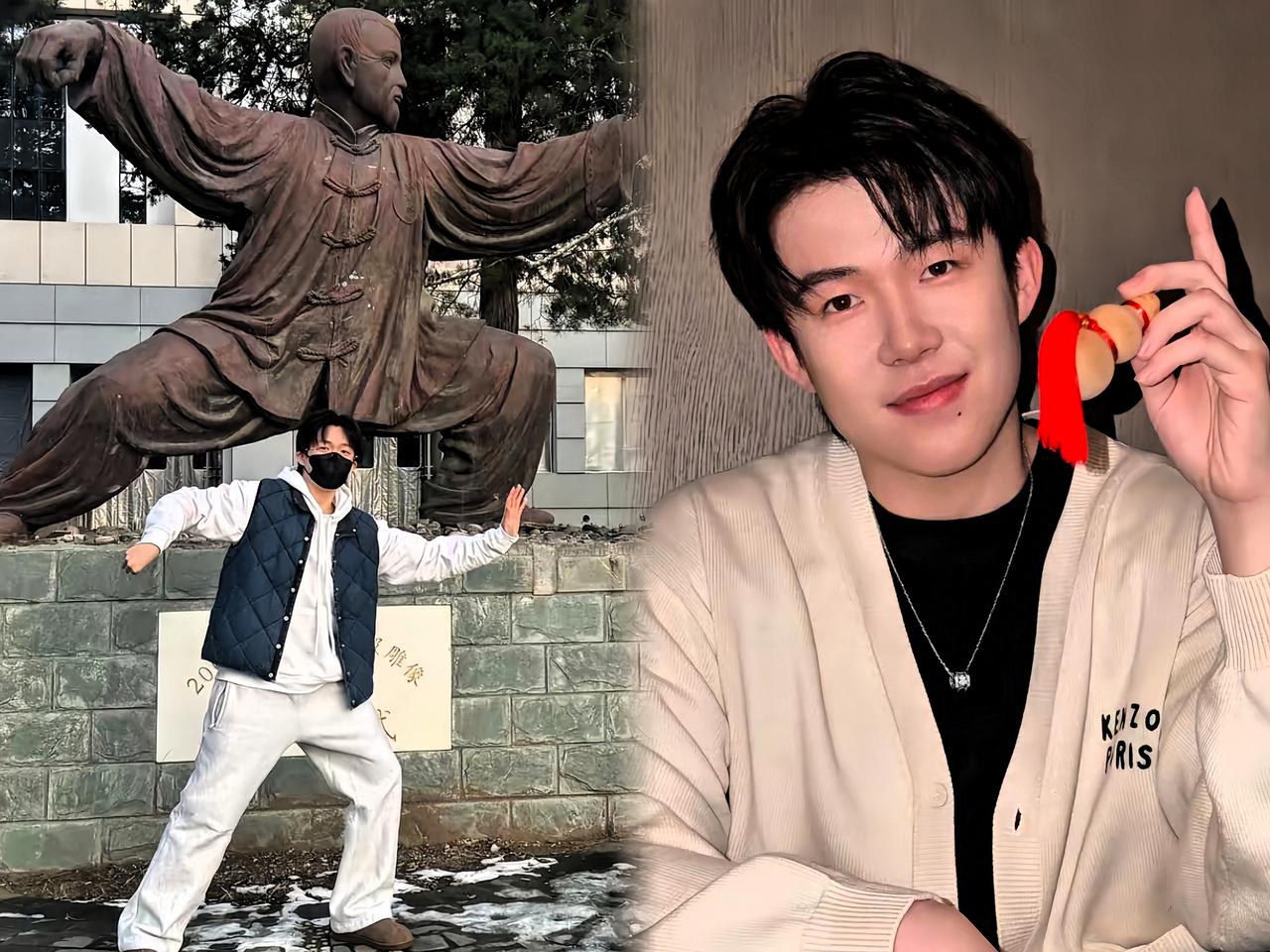 王楚钦突然晒了波日常, 配文说: “最近的停停走走”~ 点开一看, 有风景有自拍, 本来还以为他跑哪儿玩去了, 再仔细一看定位, 好家伙,这不就是北大嘛! 只见他一身休闲, 白内搭配棉马甲, 戴口罩跟身后雕塑摆了个同款pose, 模仿得那叫一个惟妙惟肖! 不愧是自带模仿技能点的人~ 这回他还戴了副眼镜, 瞬间联想到他之前调侃草莓熊的梗: “戴上镜片儿,妥妥文化人!” 顺便小声科普: 这个太极拳雕塑在北大可火了, 原型是武术大师孙禄堂, 往那儿一站就特有范儿。 细节控还发现: 手里握着小葫芦, 脖子上挂着麒麟项链, 这波是福气好运齐接住的节奏呀!