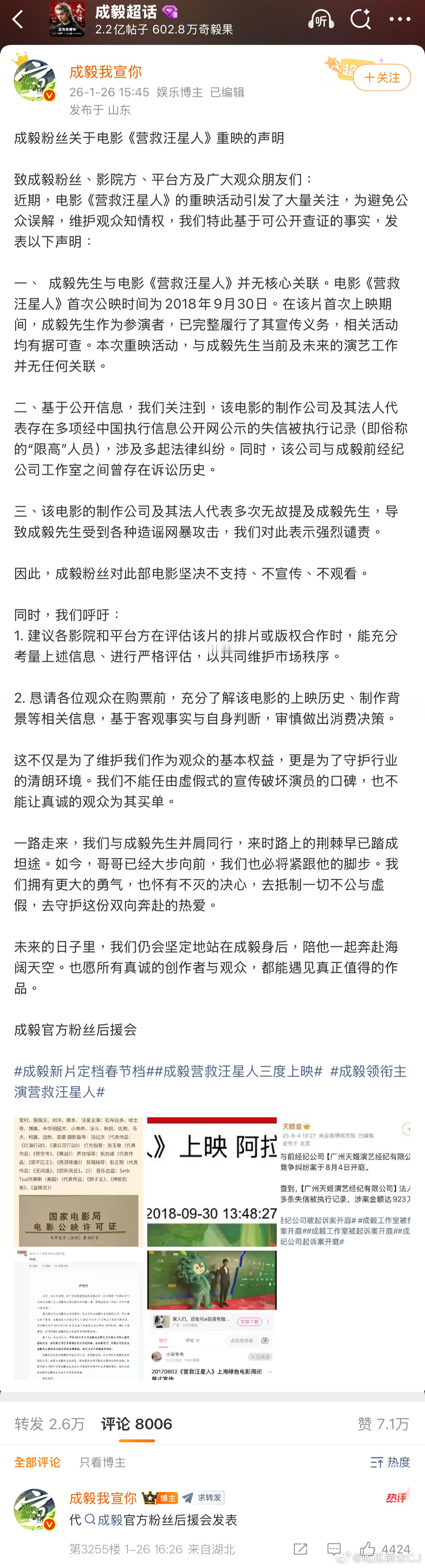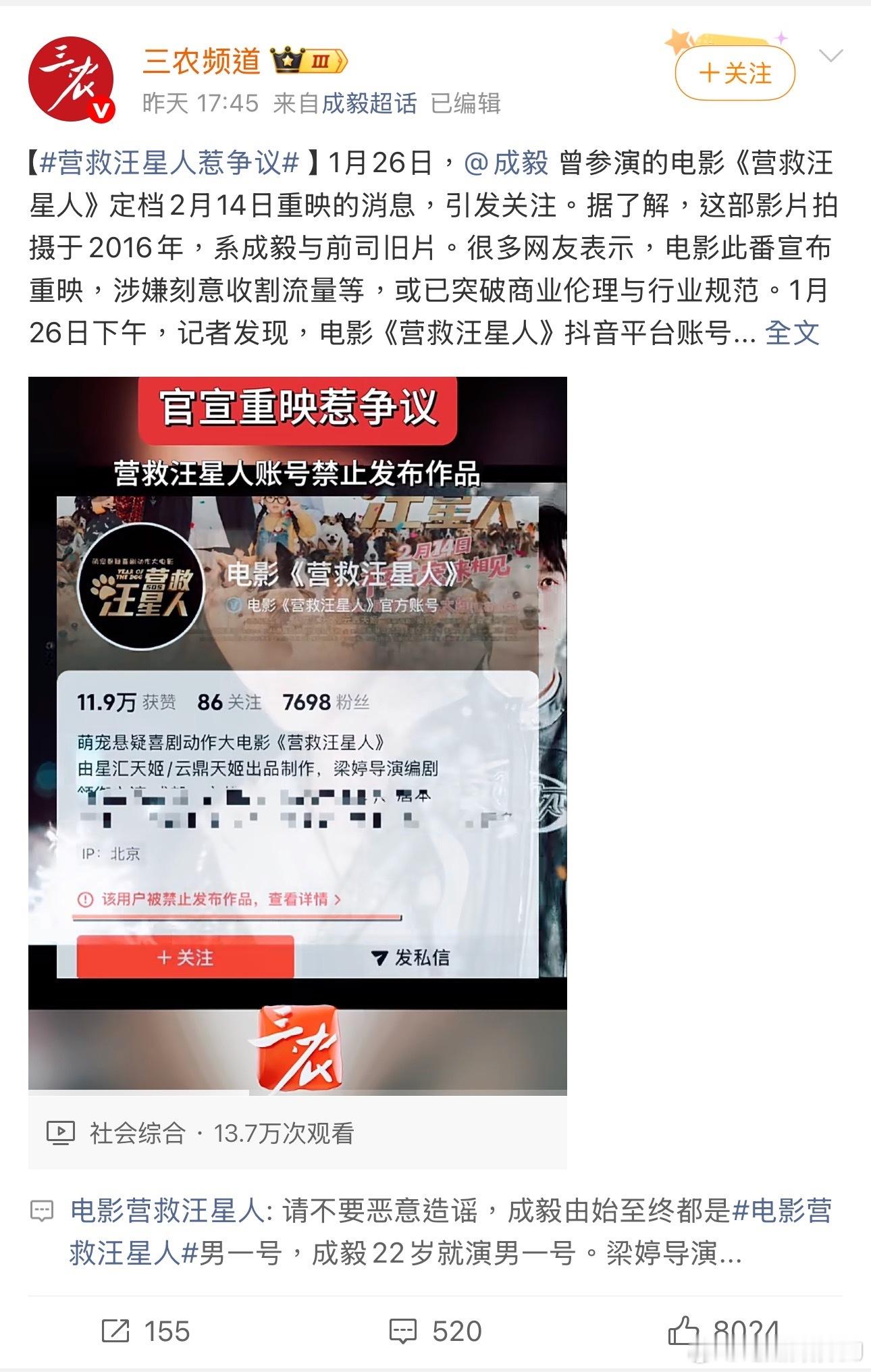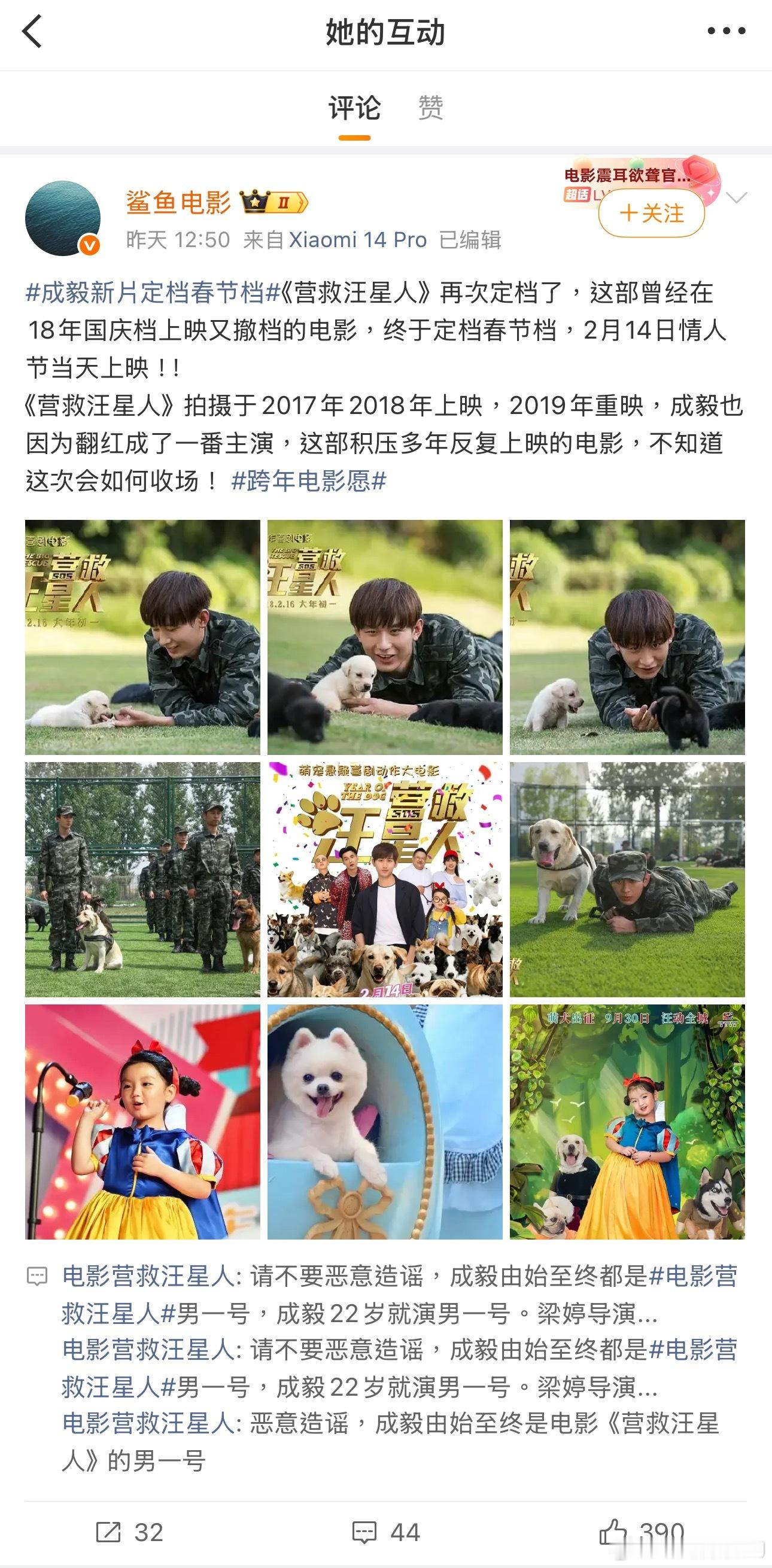 第一次见电影官方号挂粉丝的,春节档电影营救汪星人官博谜之操作:一些官号发布定档消息,提到这部电影之前定档撤档再定再撤,早期海报都是狗狗没有成毅,现在把成毅放海报中间有借势之嫌,官博在底下说人家造谣,反复强调成毅从来都是男一号,还正儿八经发了个辟谣博。然后又截图不知道是谁的辱骂私信,带成毅tag发出来,说相信不是成毅粉丝,要给大家看看披皮黑是什么样……成毅粉丝态度:上映过,成毅早就完成应尽义务,现在又来只能不支持、不宣传、不观看了。