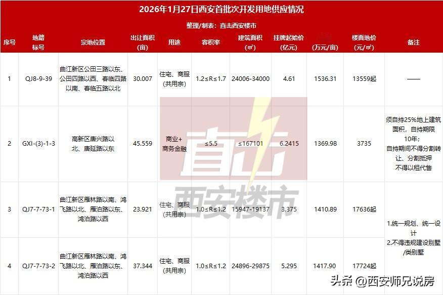 临近月底,距离过年仅剩三周时间了,今天(2026年1月27日)西安土地市场却一反常态的迎来了土地供应,而这也是今年(2026年)西安首次土地供应。这次西安共推出了10宗土地,共计451.697亩。其中,产业用地6宗,共计是314.867亩,地块涉及到灞桥区、航空基地二期、鄠邑区等三区,产业类型为其他通用设备制造业、航空航天器及设备制造业、非金属矿物制品业、通讯设备制造业、仓储物流等。 曲江的土地供应多是曲江二期电竞产业园附近和曲二犄角旮旯的小地块,不过这地价,容积率真是一绝,也算是对得起曲江这两个字啊!西安地产市场 曲江新项目 西安土拍