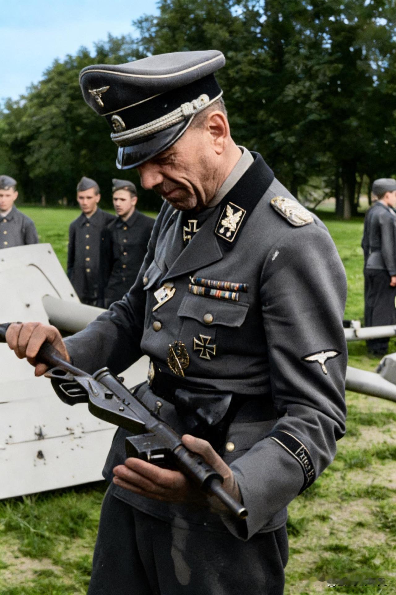武装党卫军第7“欧根亲王”志愿山地师首任师长阿瑟·菲利浦斯。他佩戴着一枚骑士十字勋章,左胸前另有一级铁十字勋章和步兵突击章。根据领章上的全国副总指挥军衔判断,他此时应已担任党卫军第5山地军军长。菲利浦斯手中拿着的是一支MP3008冲锋枪,这款冲锋枪与英国“司登”冲锋枪极为相似,是二战末期德军借鉴“司登”冲锋枪设计的应急产物,产量有限。 德国将领 德军军官服饰 德军山地师 历史 历史老照片 二战