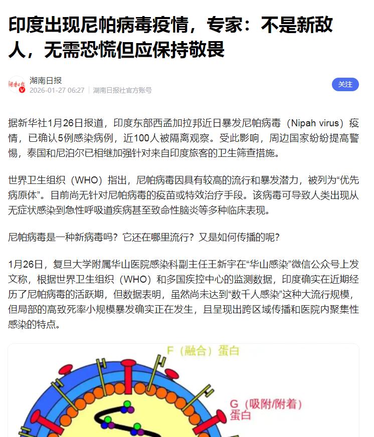 大胆的预言,2026年的黑天鹅事件,印度极有可能成为一颗“毁灭”世界的定时炸弹。 病毒从不需要签证,它要出去,全世界都拦不住,印度,正在成为全球公共卫生风险的最大引爆点。 2026年,有相当高的概率,一次全球级别的黑天鹅事件会从印度爆发。而这场灾难是生物安全,是可能颠覆人类社会秩序的超级传染病——尼帕病毒。 短短数日,5例尼帕病毒确诊病例出现,其中4人是一线医护人员,近百人被紧急隔离,一名患者因呼吸衰竭陷入危重。 这个致死率最高可达75%、和埃博拉病毒同级的“隐形杀手”,再次在印度掀起风浪。 泰国连夜关闭边境口岸,中国海关启动专项检测,尼泊尔加强入境筛查,一场跨国防疫战仓促打响,而这早已不是印度第一次直面这种致命病毒。 自2001年首次报告尼帕病毒病例以来,印度已累计爆发12次疫情,2018年喀拉拉邦疫情的致死率更是飙升至90%。 为何印度总能成为这类高危病毒的温床?答案藏在它根深蒂固的公共卫生短板里。本次西孟加拉邦疫情的传播链就很典型,最早确诊的两名医护人员,曾照料过一名未确诊就离世的重症患者,明确的院内传播,暴露了基层医疗院感防控的严重不足。 要知道,印度基层医疗机构连基本的防护设备都难以配齐,更别说规范的感染控制流程,医护人员往往只能“裸奔”式诊疗,成为病毒扩散的中间环节。 病毒的传播路径几乎和印度的生活、习俗深度绑定。尼帕病毒的天然宿主是狐蝠,而印度部分地区有饮用生枣棕榈汁的传统,这种饮品很容易被蝙蝠的尿液、唾液污染,成为人际传播的源头。 同时,印度超密集的居住环境,尤其是贫民窟里,污水横流、卫生条件恶劣,一旦出现零星病例,病毒就能在人群中快速扩散。 让人担忧的是病毒的变异潜力,2025年喀拉拉邦疫情中发现的毒株,出现了G546S基因突变,这种变化让病毒的人传人效率显著提升,其基本再生数一度达到1.7,意味着不加干预就会持续扩散。 人为因素更是让风险雪上加霜。印度的宗教集会规模堪称全球之最,2025年的大壶节就吸引了1亿至1.5亿信徒聚集恒河,所谓的社交距离、口罩佩戴规定形同虚设,数百万信徒挤在河中沐浴,现场连基本的检测设备和人手都不足,直接构成了“超级传播事件”。 这种大规模人群聚集,在病毒面前就是绝佳的扩散温床,而印度政府因忌惮宗教势力,往往不敢对这类活动进行严格限制,只能放任风险滋生。 除此之外,东北部米佐拉姆邦的部落还有捕捉食用稻田鼠的习惯,而这些老鼠携带的恙螨可能传播恙虫病,2018至2022年当地已报告近两万例病例,这类区域性传染病也随时可能因人口流动突破边界。 最可怕的是,病毒的跨境传播几乎防不胜防。尼帕病毒的潜伏期通常是4到14天,最长能达到45天,无症状感染者可能带着病毒跨国旅行,成为“移动传染源”。 印度作为人口大国,国际航班和边境往来频繁,仅喀拉拉邦的科钦国际机场,每日旅客就有5.8万人次,一旦病毒随旅客流出,凭借其凶险的症状和高致死率,很容易引发全球恐慌。 更关键的是,目前全球对尼帕病毒既无特效药,也无成熟疫苗,唯一的候选疫苗还停留在临床试验阶段,根本无法应对大规模爆发。 或许有人会说,尼帕病毒的传播力不如新冠,基本再生数大多低于1,很难造成全球大流行。 但我们不能忽视,RNA病毒的变异速度极快,一旦尼帕病毒再发生一次关键变异,获得更强的人传人能力,结合印度的传播条件,后果将不堪设想。新冠疫情已经告诉我们,任何一个国家的公共卫生漏洞,最终都会成为全球的风险。 印度的医疗资源匮乏、防控意识薄弱、习俗与病毒传播的叠加,再加上病毒本身的致命特性,让这里成为了一颗随时可能引爆的定时炸弹。 2026年的这波尼帕病毒疫情,与其说是一次突发事件,不如说是一次预警。它提醒着全球,印度的公共卫生隐患不是一个国家的事,而是全人类需要共同面对的挑战。 如果不能帮助印度补齐医疗短板、建立完善的监测体系,下一次从这里走出的病毒,或许就真的会成为颠覆人类社会秩序的黑天鹅。病毒无国界,唯有全球协同筑牢防线,才能避免这场潜在的灾难。