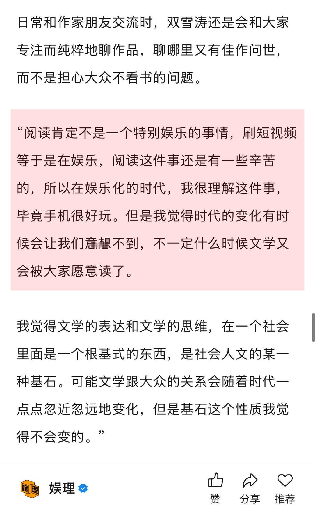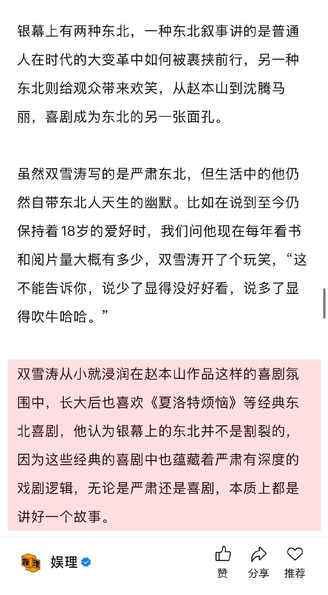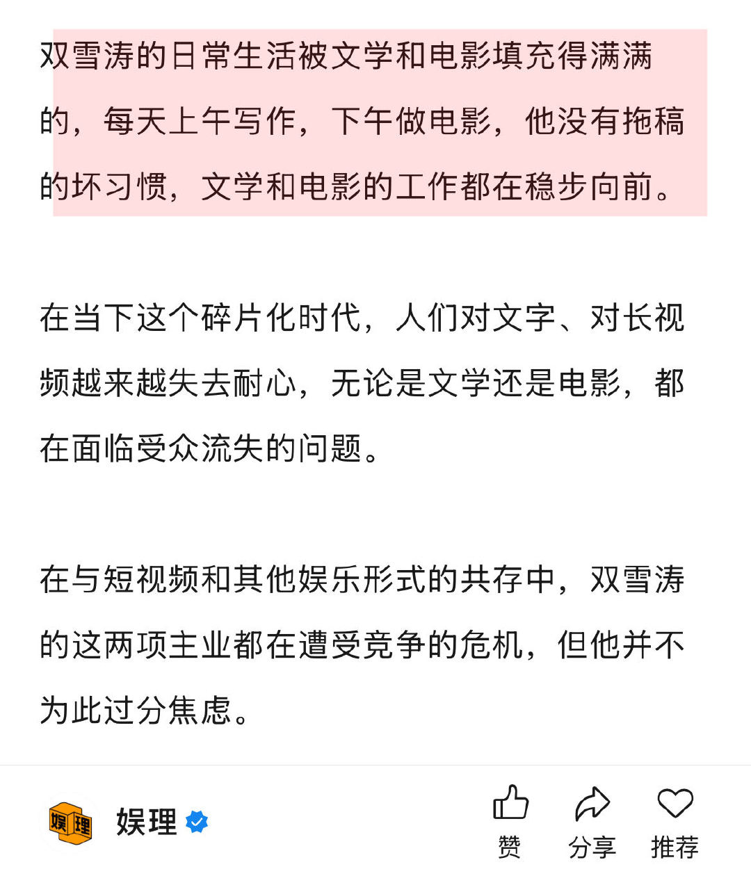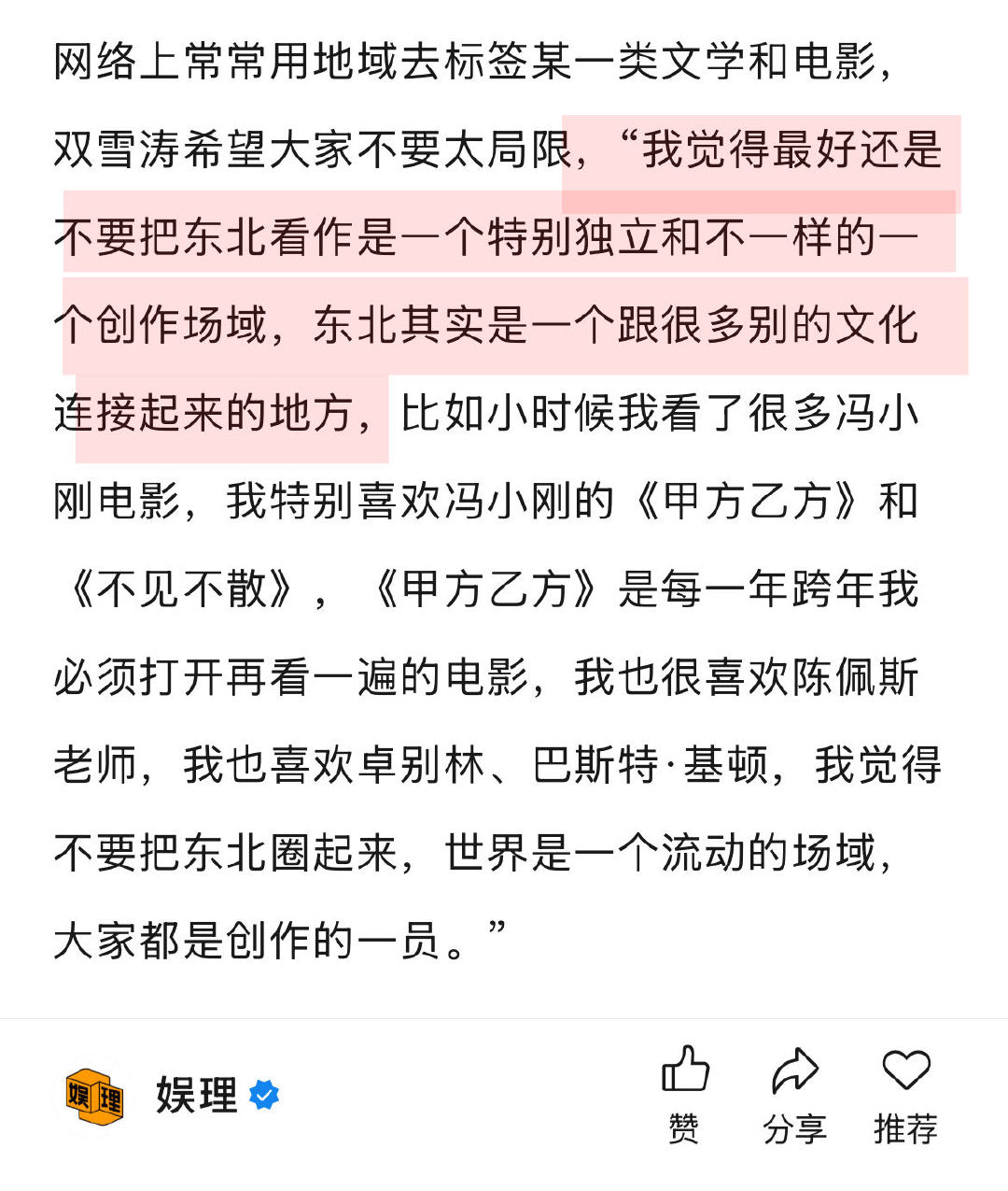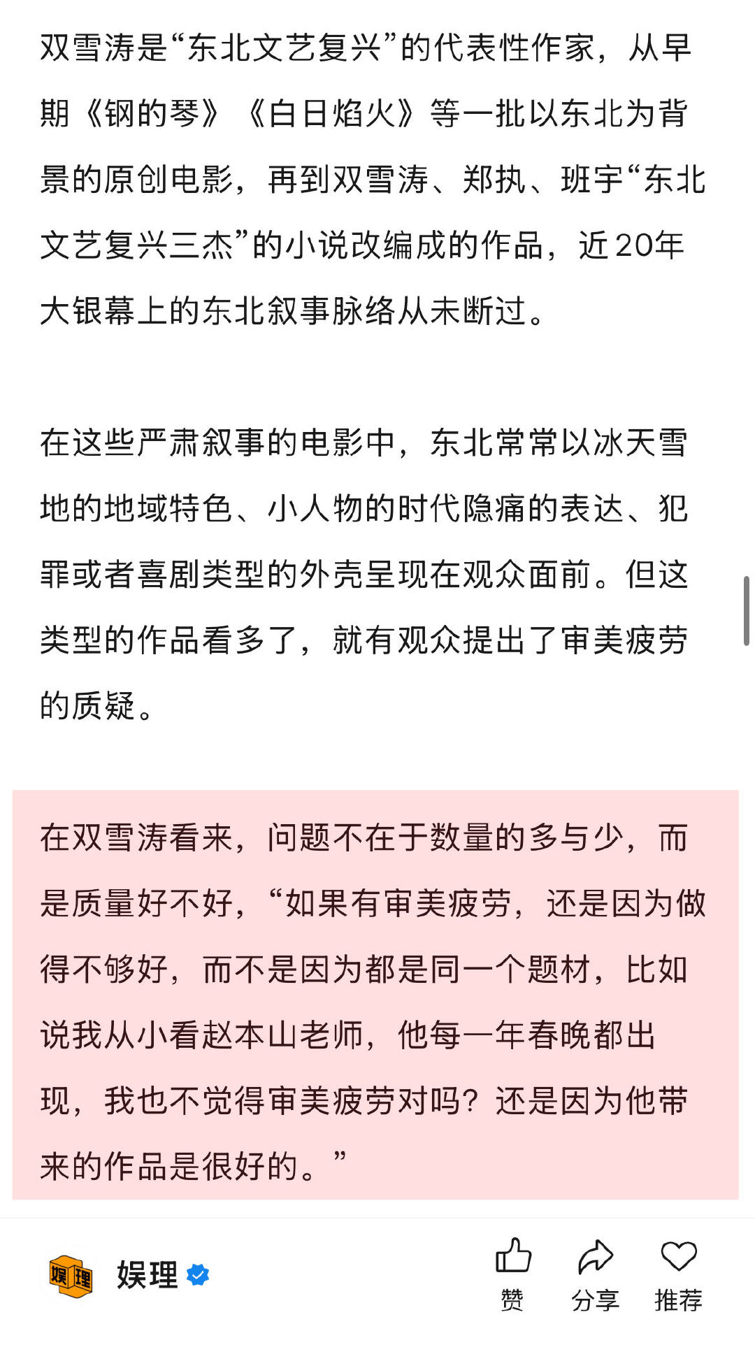 双雪涛回应作品被多次改编 双雪涛喜欢不完全遵从原著的改编 谈及在自己的作品中,是否有一部是自己非常喜欢、却没被人抢版权的作品,笑言,“那我不能告诉他们,我得留着,将来说不定自己来做。”谈及个人首部电影导演作品《刺客爱人》,他透露还在做剧本。至于什么跟大家见面,双雪涛幽默表示:“为了相约下次采访,我也会努力把电影早点拍出来。” 娱理独家↓