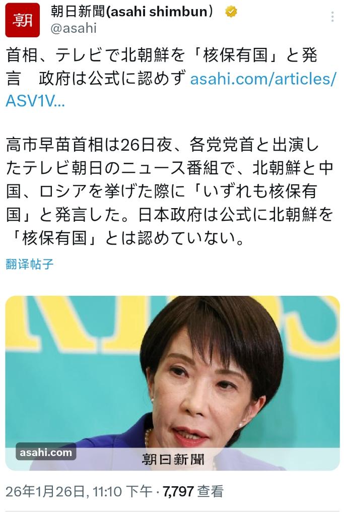 1月26日,高市早苗和其他各党的党首在出席朝日电视台的节目时,再次犯下了一个重大的外交失言。那就是把朝鲜称为是一个“拥核国”。这某种程度上再次体现出了高市本人外交常识和训练的缺乏,即在处理重大外交议题时缺乏精准的把握,以及谨慎的精神。 说白了,高市早苗这一句“拥核国”哪里是什么口误,分明是往国际核秩序的池子里扔了颗炸雷,要么是真不懂行到离谱,要么就是故意放出的试探信号。 1月26日的朝日电视台节目上,这句轻飘飘的表述一出口,外交圈瞬间炸开了锅,日本政府更是连夜紧急“灭火”,生怕这一句话引火烧身。 很多人可能觉得不就是一个称谓吗?其实这里面的门道大了去了,“拥核国”这个标签可不是随便叫的,往直白了说,它就相当于国际社会给的核武器“合法许可证”,有了这个名头,就意味着其核拥有权得到国际法认可。 而根据《不扩散核武器条约》的规定,只有中美俄英法五个安理会常任理事国,才是被明确承认的合法拥核国,这是基于条约里的“祖父条款”,特指1967年1月1日前成功试爆核武器的国家。 朝鲜的核地位显然不在此列,尽管朝鲜确实进行过核试验,拥有一定核威慑能力,但它既不是条约认定的合法拥核国,还曾在2003年退出该条约,从国际法层面来说,其核拥有状态属于“非法公开”范畴,和合法拥核国有着本质区别。 把朝鲜归为“拥核国”,本质上就是模糊了这种合法与非法的边界,直接动摇了国际核不扩散体系的根基。 有意思的是,这不是高市早苗第一次“越界发言”,去年11月她就抛出过“台海有事就是日本有事”的争议言论,两次发言都刻意避开外务省的标准表述,非要用极具情绪性的词语刷存在感。 而这次日本政府火速撇清,称这并非官方立场,也从侧面印证了这句话的敏感性——专业外交人士都清楚其中的风险,唯独她偏要“另辟蹊径”。 于是就有了一种更值得琢磨的声音:她不是不懂,而是故意这么说的。作为日本政坛极具保守倾向的人物,她的每一次出格发言,都可能在为军国主义复活铺垫舆论。 毕竟战败国的身份让日本被禁止拥核,可要是先把朝鲜称为“拥核国”,制造出“周边国家都有核”的舆论氛围,再顺势抛出“日本也需拥有核力量自保”的论调,逻辑链就完整了。 这种刻意强调的背后,更像是在试探国际社会的反应,透露出日本想突破核限制的真实目的。 目前朝鲜方面还没有公开回应,但已经悄悄调整了表述,把“核强国”换成了“有核威慑力量的主权国家”,这种细微变化也暗藏着对局势的考量,说到底,一句称谓的背后,是复杂的外交博弈和战略试探。 以上仅为个人看法,你觉得高市早苗这番言论是真失言还是刻意为之?日本是否在借机推动拥核议程?欢迎在评论区留下你的观点。