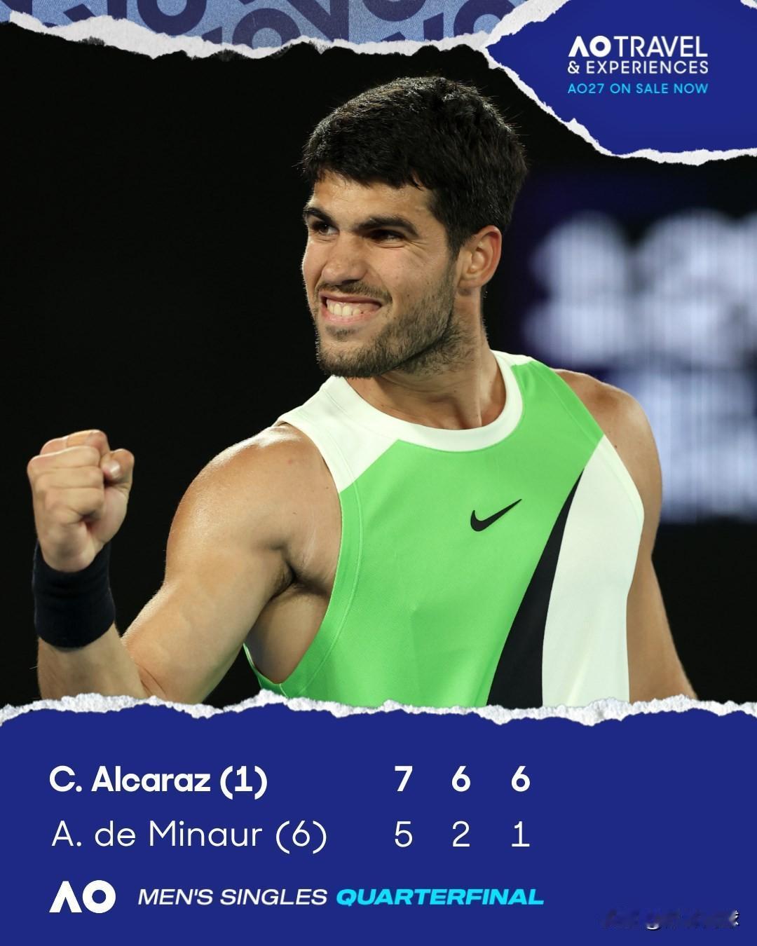 🇪🇸阿卡拉斯7-5/6-2/6-1德米纳尔🇦🇺 首次晋级澳网四强 个人第10个大满贯半决赛 解锁四大满贯全部四强 半决赛对阵兹维列夫🇩🇪