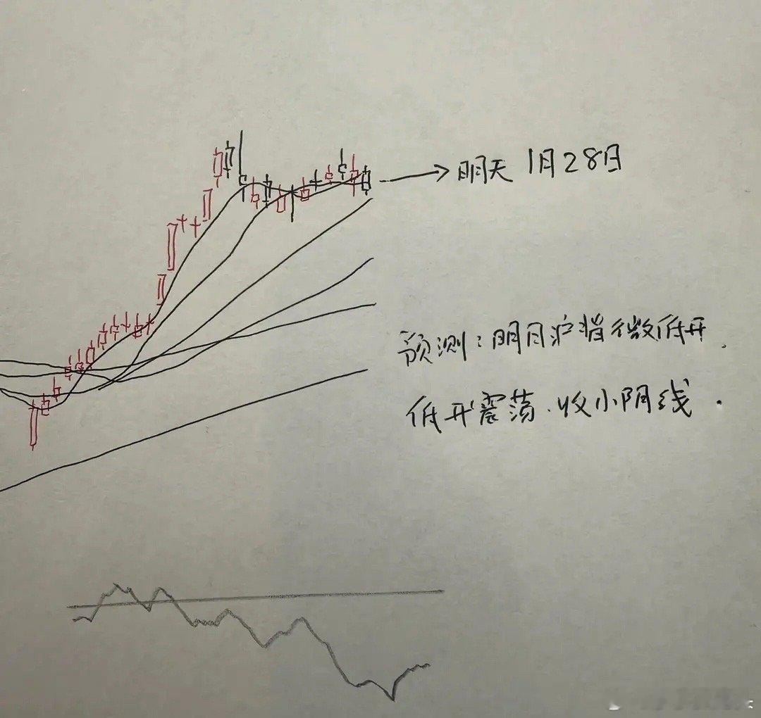 今天A股探底回升,明天A股怎么走?到底是涨是跌?莎莎讲三个具体理由:第一,今天早盘小盘个股出现了大幅度的回撤,以中证2000指数为例大家请看图一,中证2000指数,早盘跌幅达到了2.48%,虽然午后大幅度的探底回升,最终收涨0.27%。但是这种高位的长下影线,往往有向下“仙人指路”的K线的信号。也就是说,今天中证2000指数的下影线,很可能在接下来几个交易日就会被再次二次确认,二次回踩。第二,以上证指数为例,上证指数今天低点跌破了昨天的低点,并且上证指数昨天的高点是4160点,并没有突破近日的最高点4190点。从上证指数来看,不仅出现了重心下移的倾向,而且出现了阶段高点下移的倾向。第三,今天推动指数大幅拉升的半导体板块,本身处在相对的高位,而且是连续拉升之后的相对高位。今天半导体板块大幅上涨3.9%,但是从半导体板块的日线图来看, MACD红色柱状线开始缩短,代表了短线上涨动能其实已经有所衰减。今天虽然大幅反包昨天的阴线实体,但是很有可能半导体依然处于相对高位的箱体走势。也就是说明天半导体板块很可能就会再次陷入到震荡回落的走势。包括近期连续大涨的贵金属方向,有色金属方向,莎莎认为短线也要防止这些方向,可能会出现震荡调整的走势。所以这一些大权重板块,接下来可能会对A股短线指数的走势形成一定的压力。所以综合以上的分析,对于明天市场走势,莎莎认为明天市场或者走出小幅度的震荡回落的走势,明天市场收阴线的概率相对较大。那么明天A股到底怎么走?大家请看图二关于明天走势的手绘预测图:最后我想补充一点的是,其实今天市场下跌的家数是达到了3400多家。虽然上证指数最终翻红了,但是确实市场今天其实本质是倾向于调整的。而问题也就出在这里,当前市场的走势,包括近年以来的走势,其实是很难判断的。每到关键技术拐点的时候,市场往往会走出一些出人意料的反转走势。所以今年以来,对于我这个纯技术派老手来说,对于市场的预判,确实感受到了前所未有的难度。希望大家能够理解,预判走势,其实是非常难的一件事情。兄弟姐妹们点赞,评论就是对我这个纯技术派的最大支持!