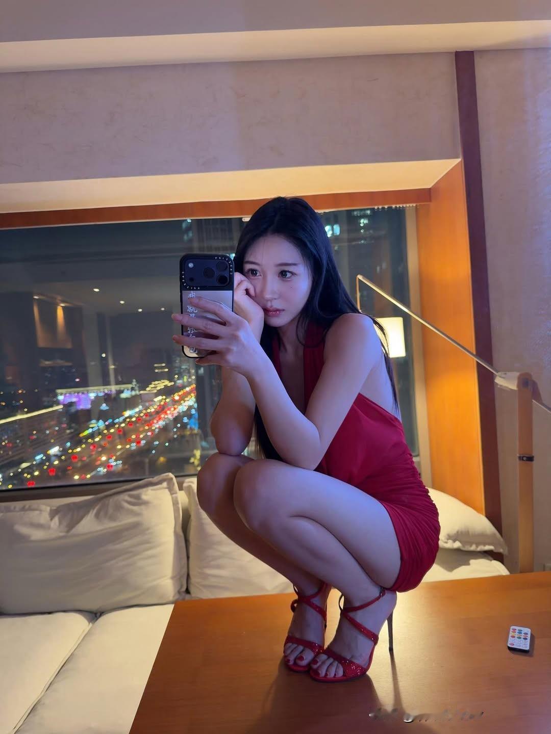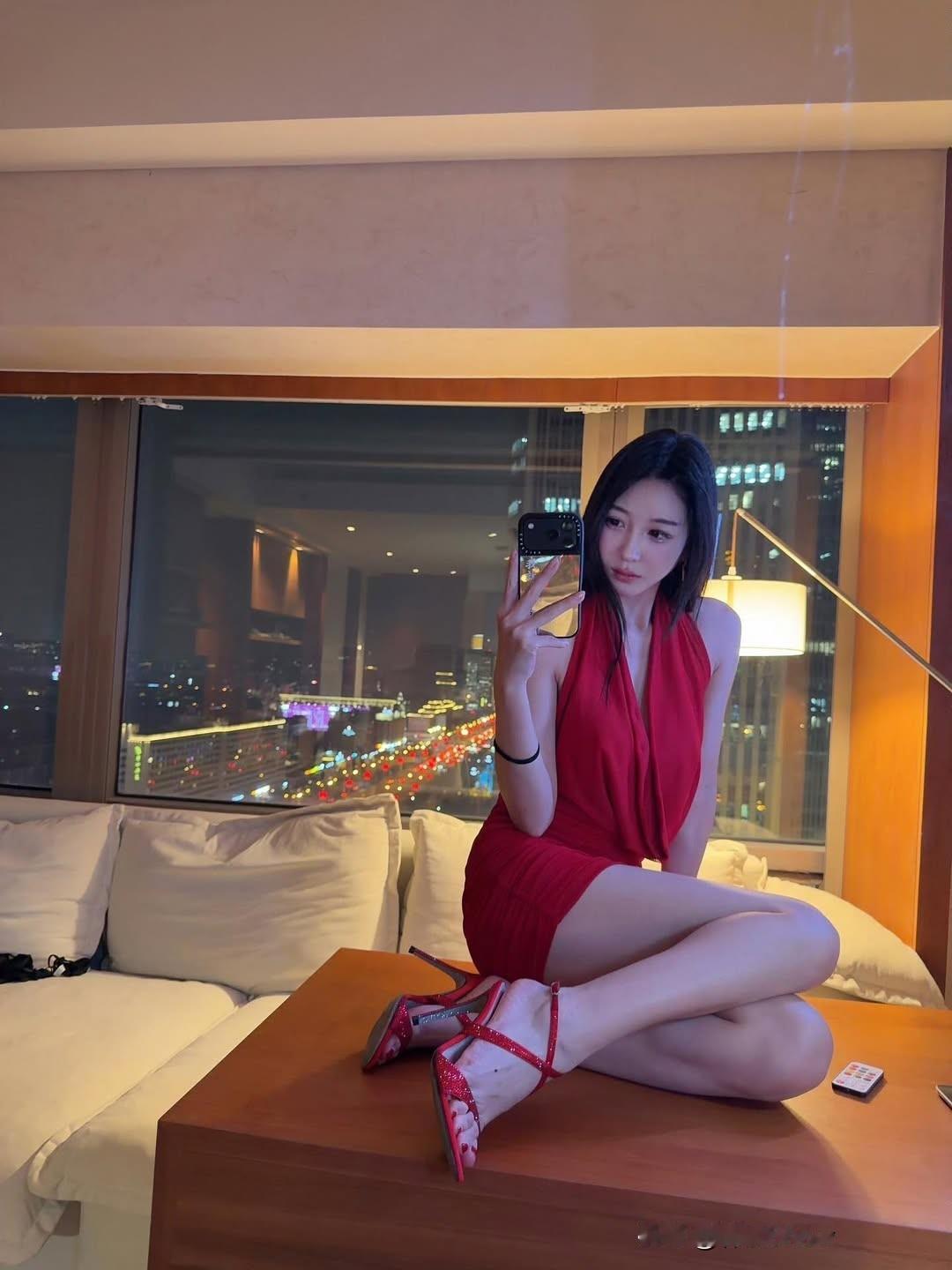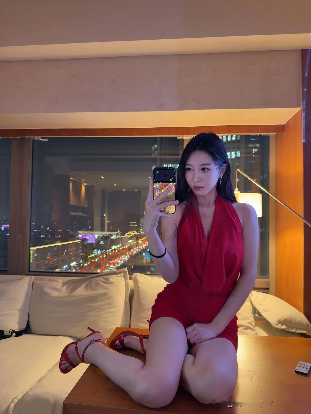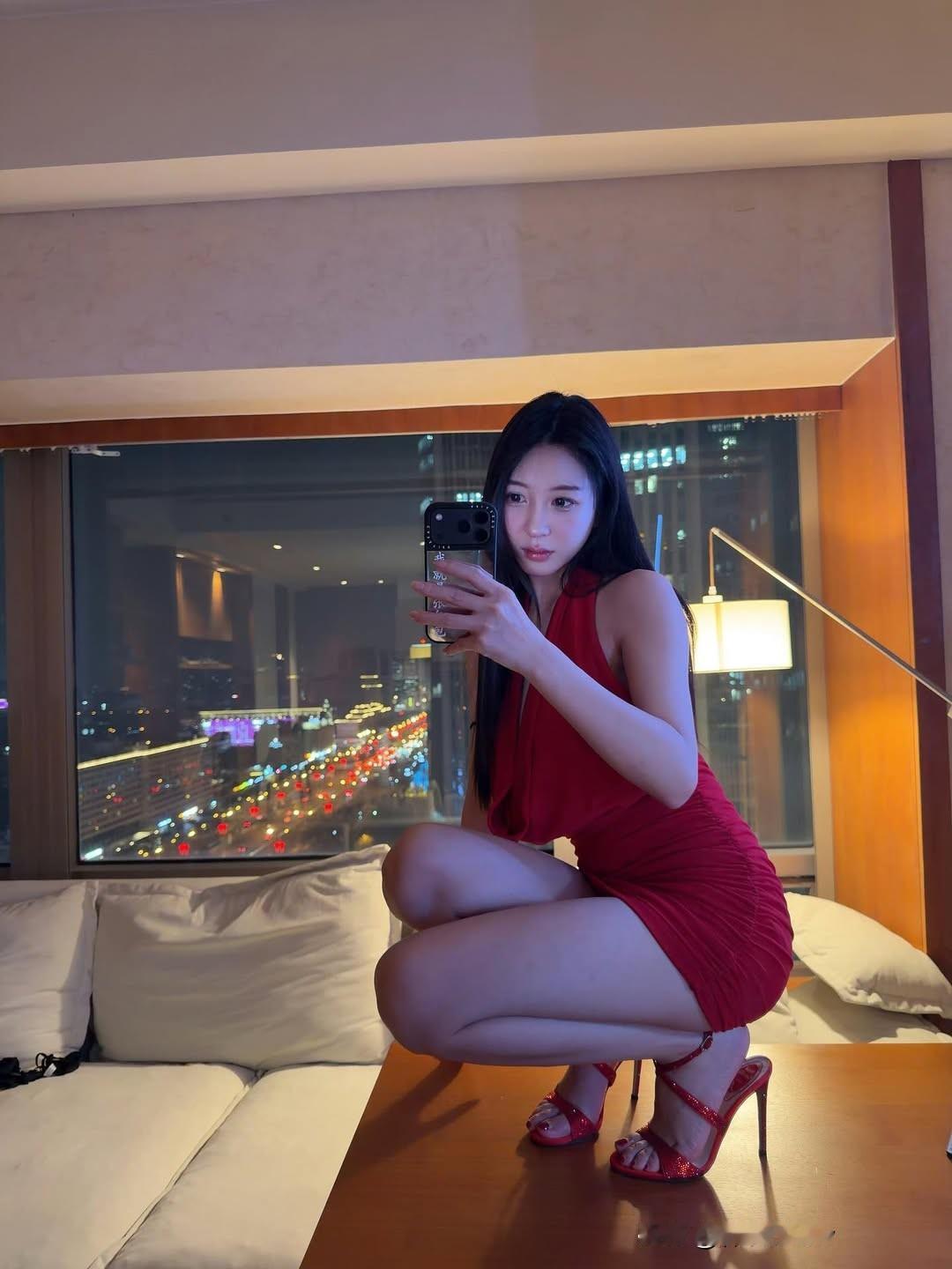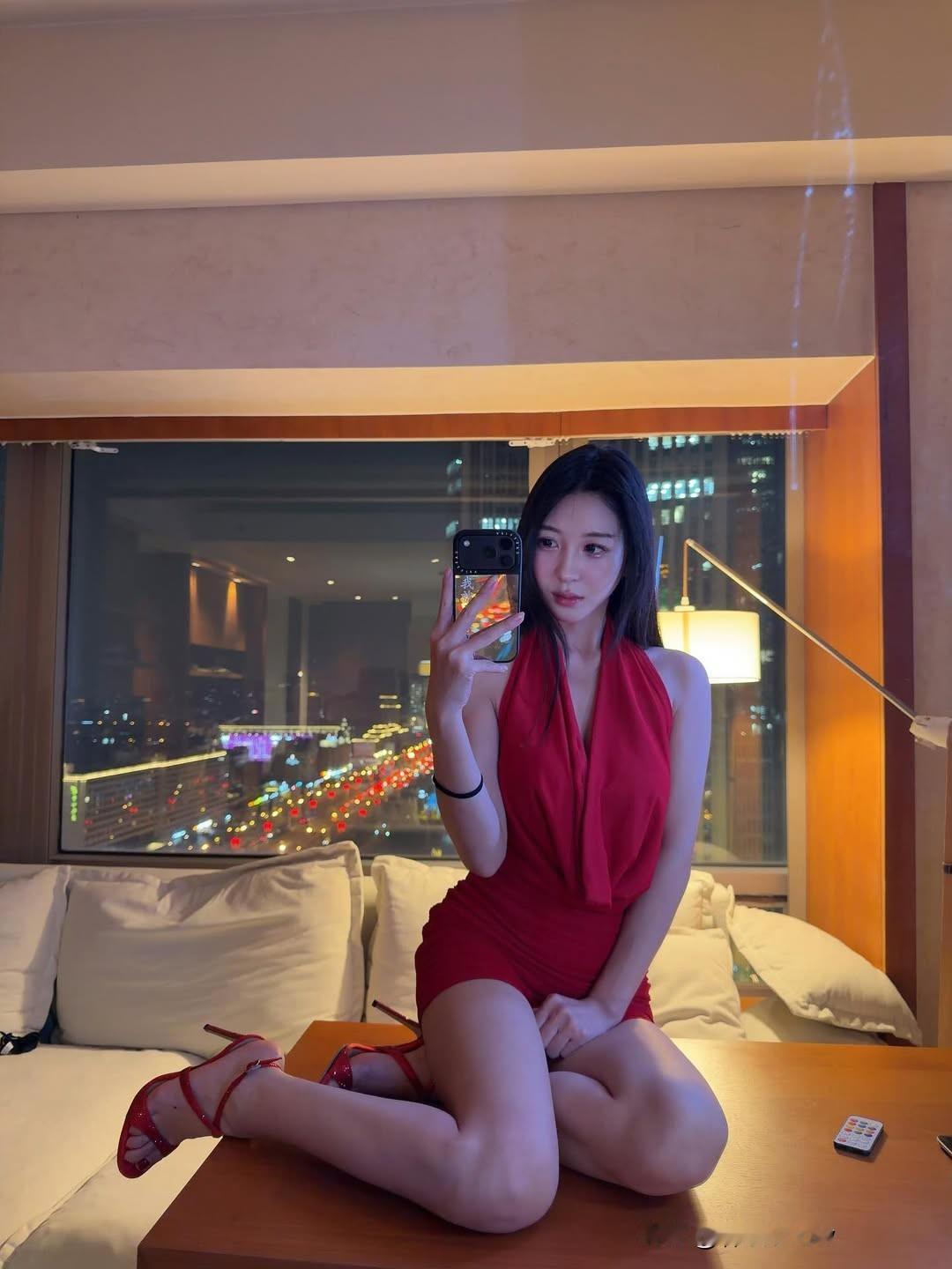 都市夜景下的红裙少女,时尚与优雅的完美结合。大长腿