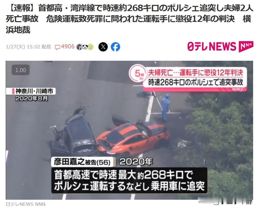 时速268公里的夺命保时捷:拖延6年,判决终于出炉! 这是一起震惊全日本、发生在2020年8月“首都高速湾岸线”的惨剧。 当年,56岁的被告彦田嘉之驾驶保时捷,在公路上以接近高铁速度的“时速268公里”疯狂飙车,最终追尾前方车辆,导致一对分别为70岁和63岁的普通夫妇当场不幸身亡。 横滨地方法院今日(1月27日)正式宣判:判处被告有期徒刑12年(检方此前求刑15年)。 判决与审理关键: - 恶性程度极高:法官痛批,这种“脱离常规”的超高速驾驶,一旦发生事故致死率极高,行为极其恶劣。 - 自大与自私:判决指出,被告过度迷信自己的驾驶技术,导致危险意识低下,这种“以自我为中心”的驾驶态度必须受到严厉谴责。 - 危险驾驶罪成立:尽管被告律师极力辩称仅构成“过失致死”,但法官认可检方主张,认定其行为符合“无法控制速度”的危险驾驶致死罪。 令人愤怒的被告自白:在审理过程中,被告竟然表示:“我以前就开过200公里以上的速度,大概有五六次了。”“我并没有强烈意识到开太快会有什么危险。” 这对受害夫妇原本只是平稳地行驶在路上,却因为他人的狂妄与自大,人生在瞬间被迫画上句号。虽然判决已定,但对家属而言,这12年的刑期是否足以抵偿两条人命,依然是心中永远的痛。 保时捷车祸 交通安全