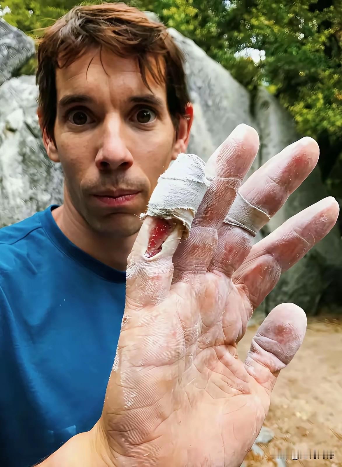 亚历克斯的手,原来也是有血有肉的,以往我们隔着屏幕看到的,都是他徒手攀爬的高光时刻,都是徒手挑战的一个个不可能,都是鲜花和掌声,但是当看到他的手时,感觉这也是一只再普通不过的手,而且也有受伤的时候,一双普通的手,挑战了这么多次不可能,最关键的不在手,而是他强大的内心!