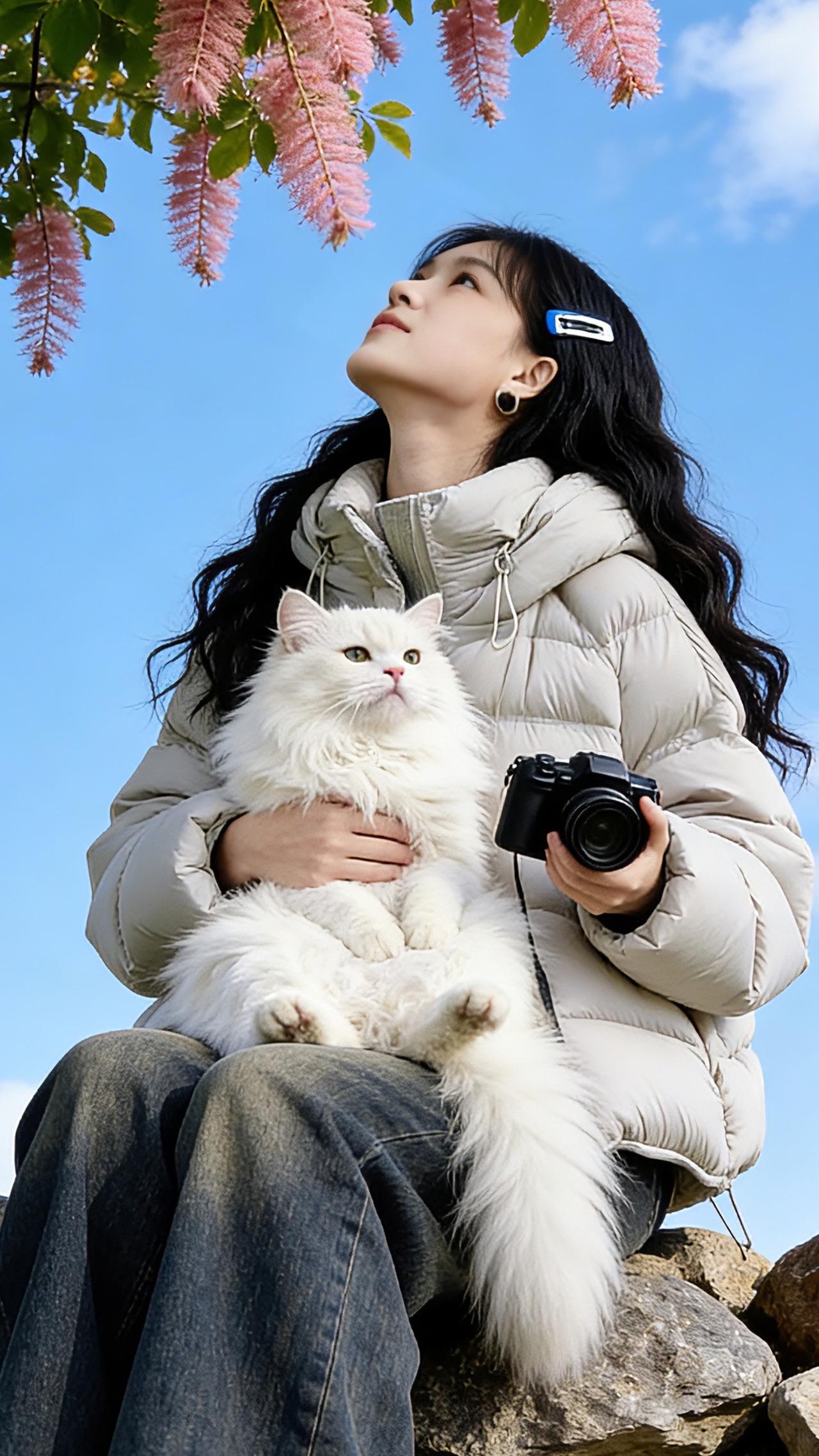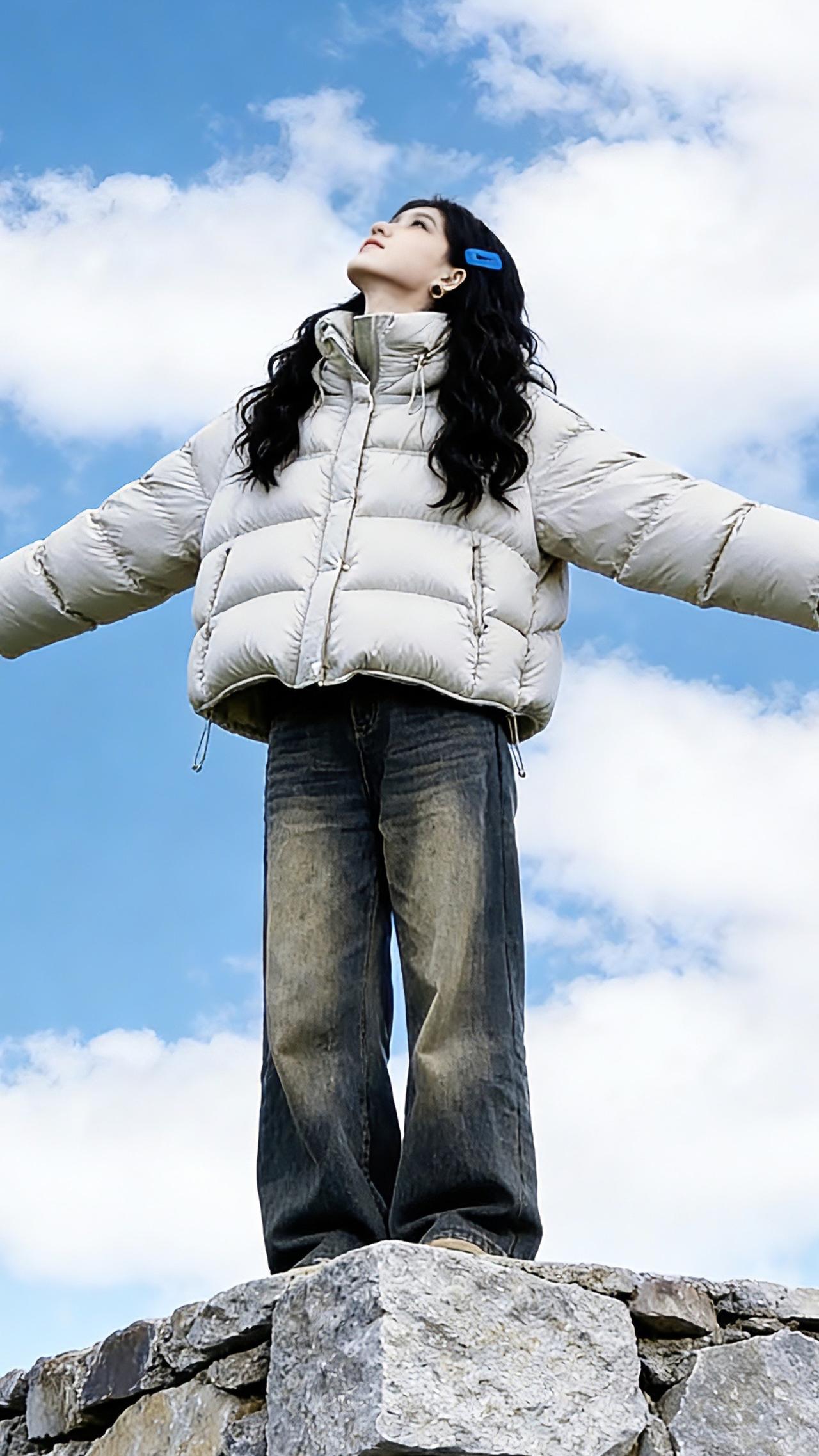 一个年轻亚裔女孩,黑色长卷发,戴着蓝色发夹,穿着和照片同款衣服,坐在石墙上,抬手