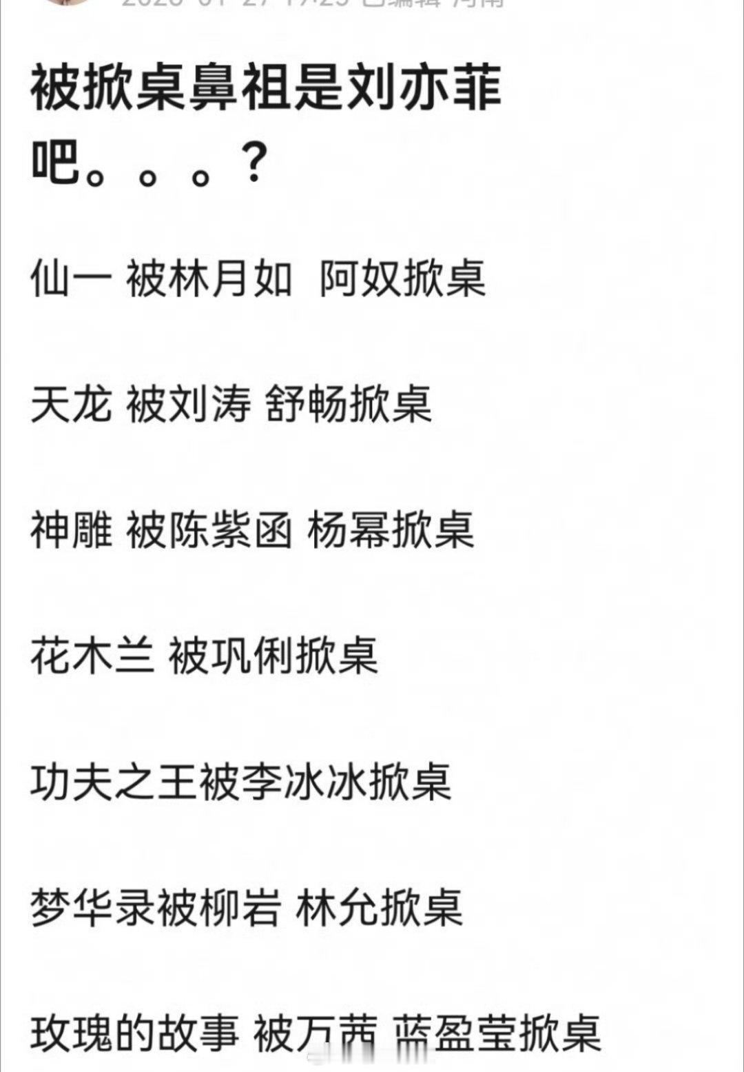 网友热议感觉被掀桌的鼻祖是刘亦菲,多部主演的剧里面,女二女三的角色都很突出,还罗列出来了掀桌的人,你咋看呢?