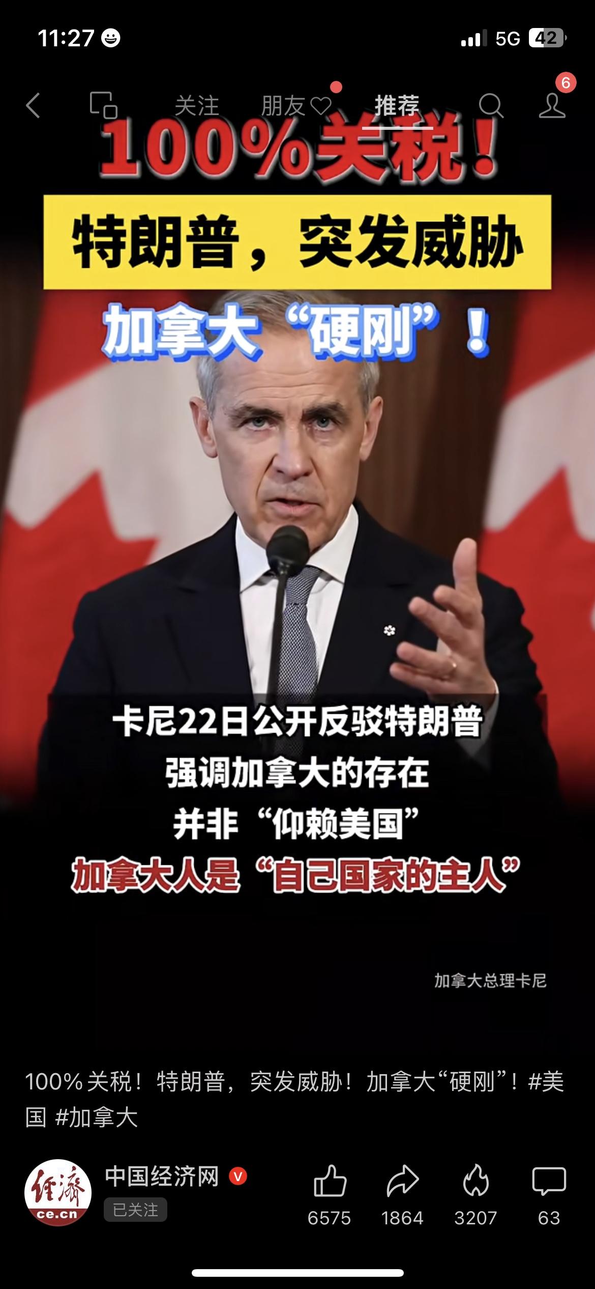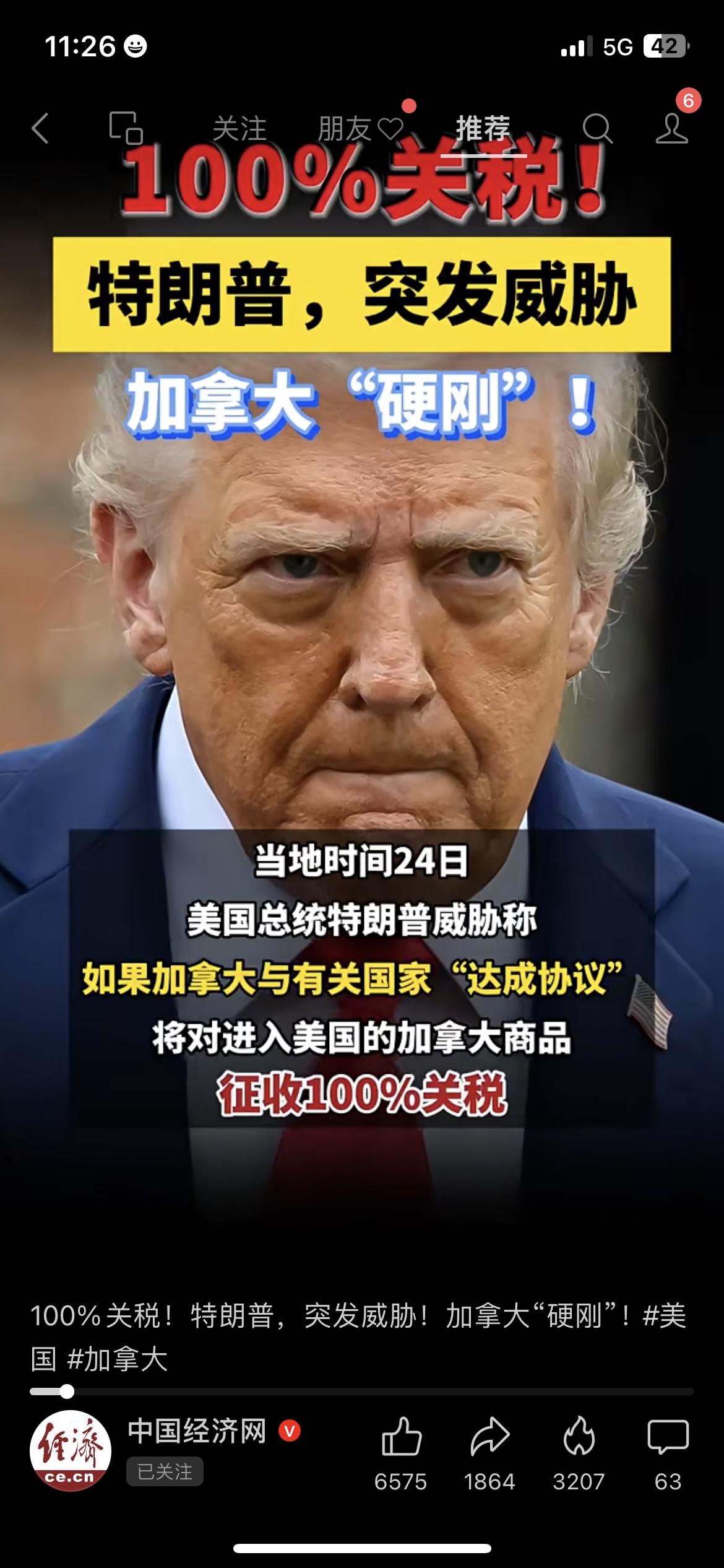 💥特朗普又掀贸易战!威胁加征100%关税 特朗普突然发难,威胁对加拿大加征**100%**关税,还直言“加拿大存在全靠美国”,加拿大当场硬刚回怼,北美贸易链彻底慌了。 我做外贸的朋友说,手里的北美订单都开始暂缓了。 你觉得这会冲击全球贸易市场,还是只是口头博弈? 特朗普 加拿大
