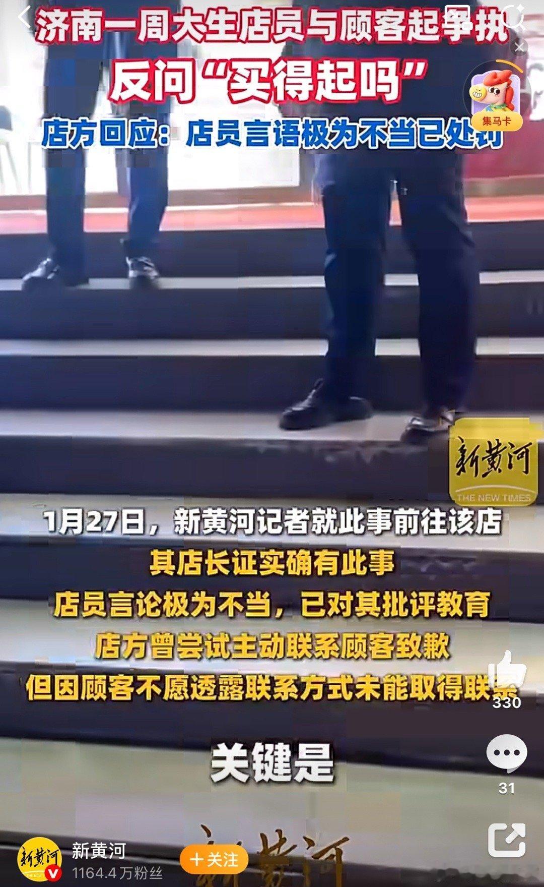 金价在疯涨,怎么有些金店店员的脾气也见长啊,周大生店员反问顾客买得起吗…… 济南一女子在济南泉城路周大生门店询问金手串挂坠能否单独购买时,店员回应“要买就买一整条”,态度不耐烦,因此产生口角。 顾客表示将投诉后离店,店员追出店外继续争执,并反问“买得起吗”,过程被视频记录。 不管怎么说 冲这个态度对待顾客 店员把自己当成老板了吗? 有时候特别反感有些销售员,只要消费给你一个笑脸,不消费当面就各种阴阳怪气,自己都在当牛马打工人,还要阴阳消费者,挺恶心的操作 ! 为啥要互相伤害呢,人家来看,肯定是有点意愿咯,来看看行情或者商品,正常不都要看看询问一下再决定买不买,店员如果有钱,还用在这里站柜台嘛,没有消费者去消费,他们没业绩不得喝西北风。 金价疯涨店员身价也一起涨了么?服务行业这样对顾客还是生意太好了,如果是你们被这样对待还会购买该品牌吗?
