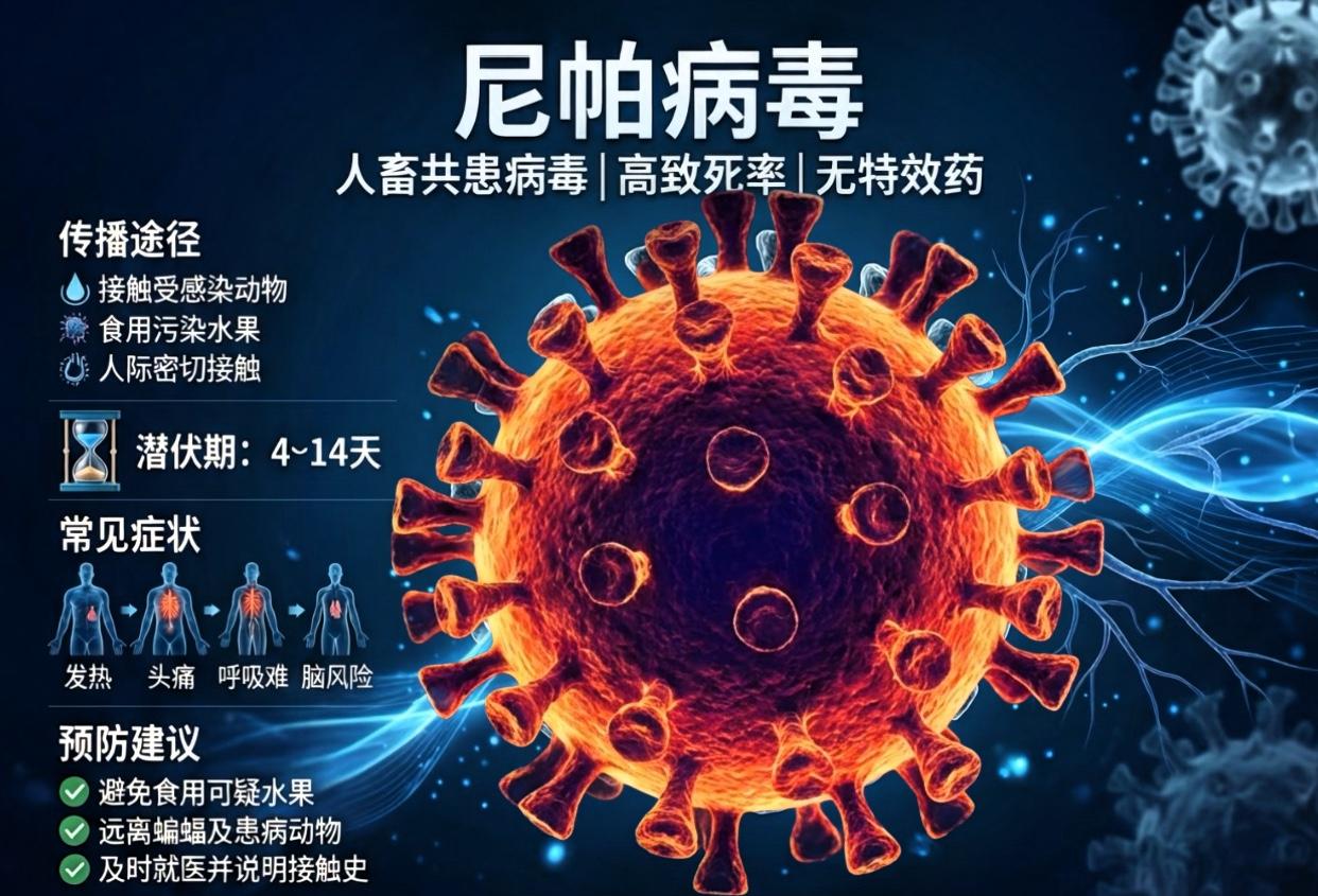 警惕! 口罩估计又要来啦? 心里一哆嗦!刚安稳没多久,印度那边突然传来尼帕病毒爆发的消息,听着就头皮发麻。 最新消息显示,印度西孟加拉邦已确诊5例尼帕病毒感染病例,近100人因密切接触被紧急隔离观察。这病毒可不是小麻烦,靠飞沫和唾液就能传播,潜伏期最长能到45天,隐蔽性极强。 更让人揪心的是,它的致死率高达40%-75%,目前全球还没有获批的疫苗,也没有特效药,治疗主要以支持性护理为主。不过好消息是,口服药VV116已被证实对尼帕病毒有显著抗病毒活性,为治疗提供了潜在方向。 这病毒的源头是果蝠,早在1998年马来西亚就曾爆发过,当时为了切断传播链,当地扑杀了上百万头猪才勉强控制住局势。这次疫情发生在印度西孟加拉邦的城市区域,这里人口密集,也有不少游客前往,因此引发各国重视。 巧合的是,这次疫情又赶在春节临近,难免让人联想到当年的情景。虽然目前没有权威消息提及外交部相关出行提醒,但春节计划出境的朋友,建议避开疫区,做好个人防护。 咱们离疫区虽远,但也不能大意。不过大家也不用过度恐慌,尼帕病毒人际传播多发生在近距离密切接触场景,普通社交接触风险较低。做好勤洗手、戴口罩等基础防护,就能有效降低风险,安心过个好年~ 【免责声明】素材、图片均来自网络,无不良引导,如有侵权请及时联系作者会主动删除。 尼帕病毒防控 春节出行安全