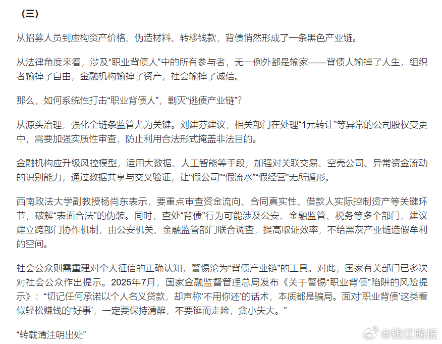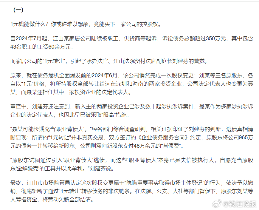 【#起底1元卖公司背后职业背债黑产链#】“1元卖公司”,这究竟是“跳楼价”甩卖,还是精心设计的逃债陷阱?江山法院去年在审理一起追索劳动报酬纠纷时,揭穿了“1元卖公司”背后的逃债把戏——一家负债累累的企业,以1元将公司股权全数转让,实则是恶意拖欠职工工资,让他人成为“替罪羊”。通过“穿透式”审查,维护劳动者合法权益,这一案例被写进今年1月27日公开见报的浙江高院工作报告中,也让一个以“职业背债人”为核心的逃债链条浮出水面。 (潮新闻 记者 张蓉 吴柯沁)