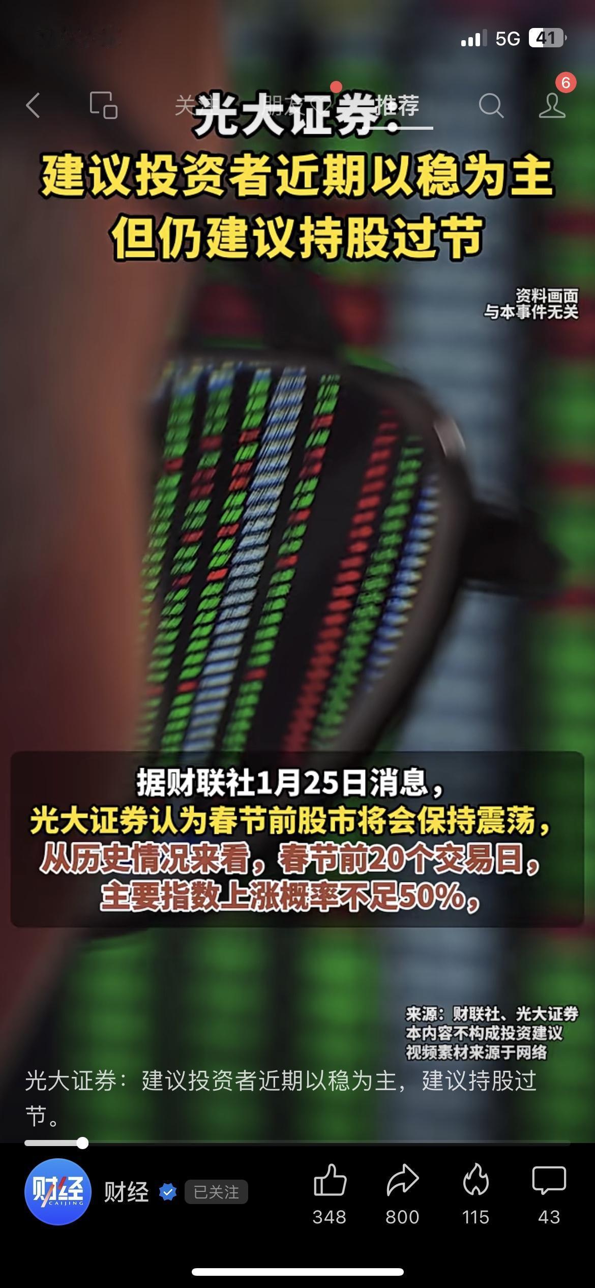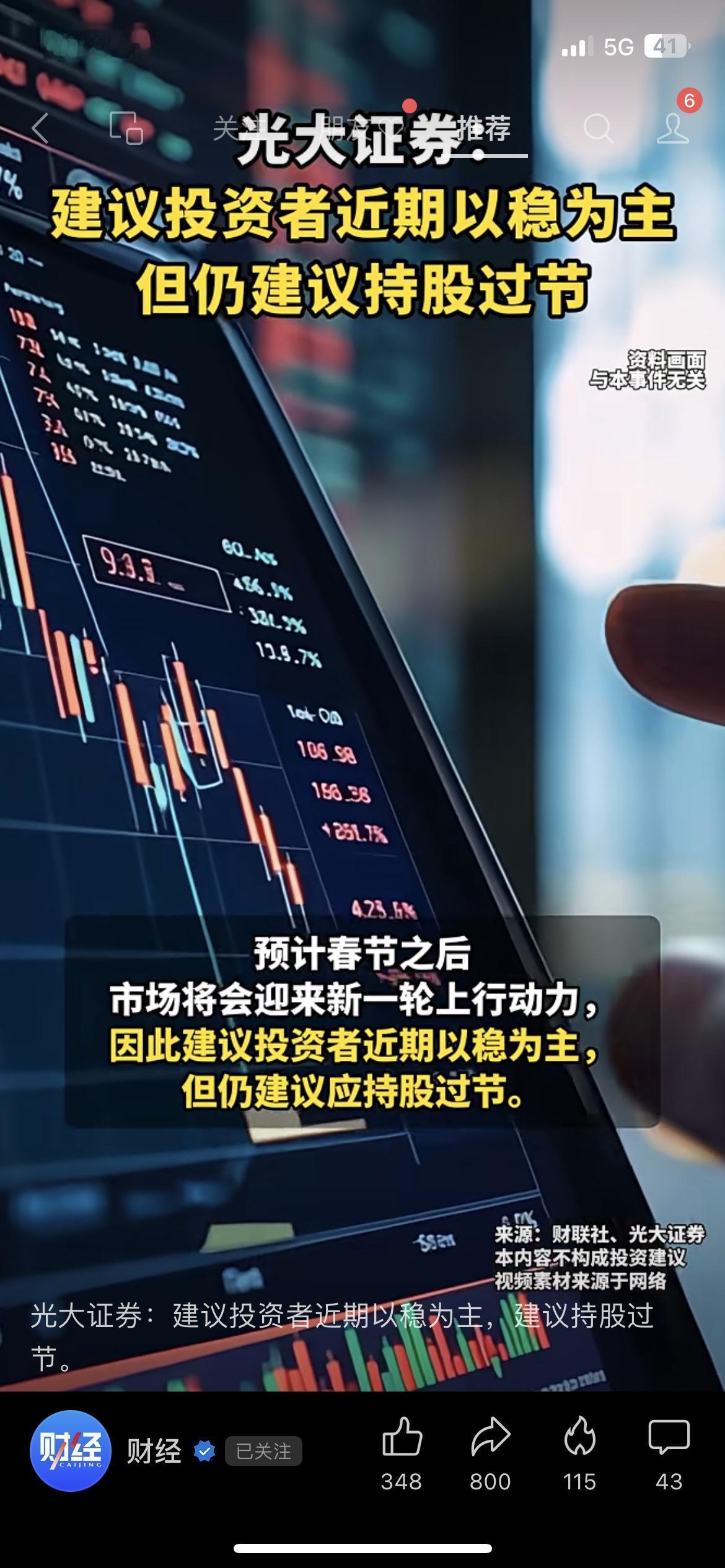 📢光大证券喊话!直接建议A股持股过节 光大证券最新研判:近期市场以稳为主,建议持股过节,还说春节后大概率有新一轮上行动力。 身边老股民都纠结坏了,有人想落袋为安,有人想跟着机构赌一把。 你会选择持股过节博收益,还是清仓离场保本金? A股 持股过节 财经热点 市场有风险,投资需谨慎