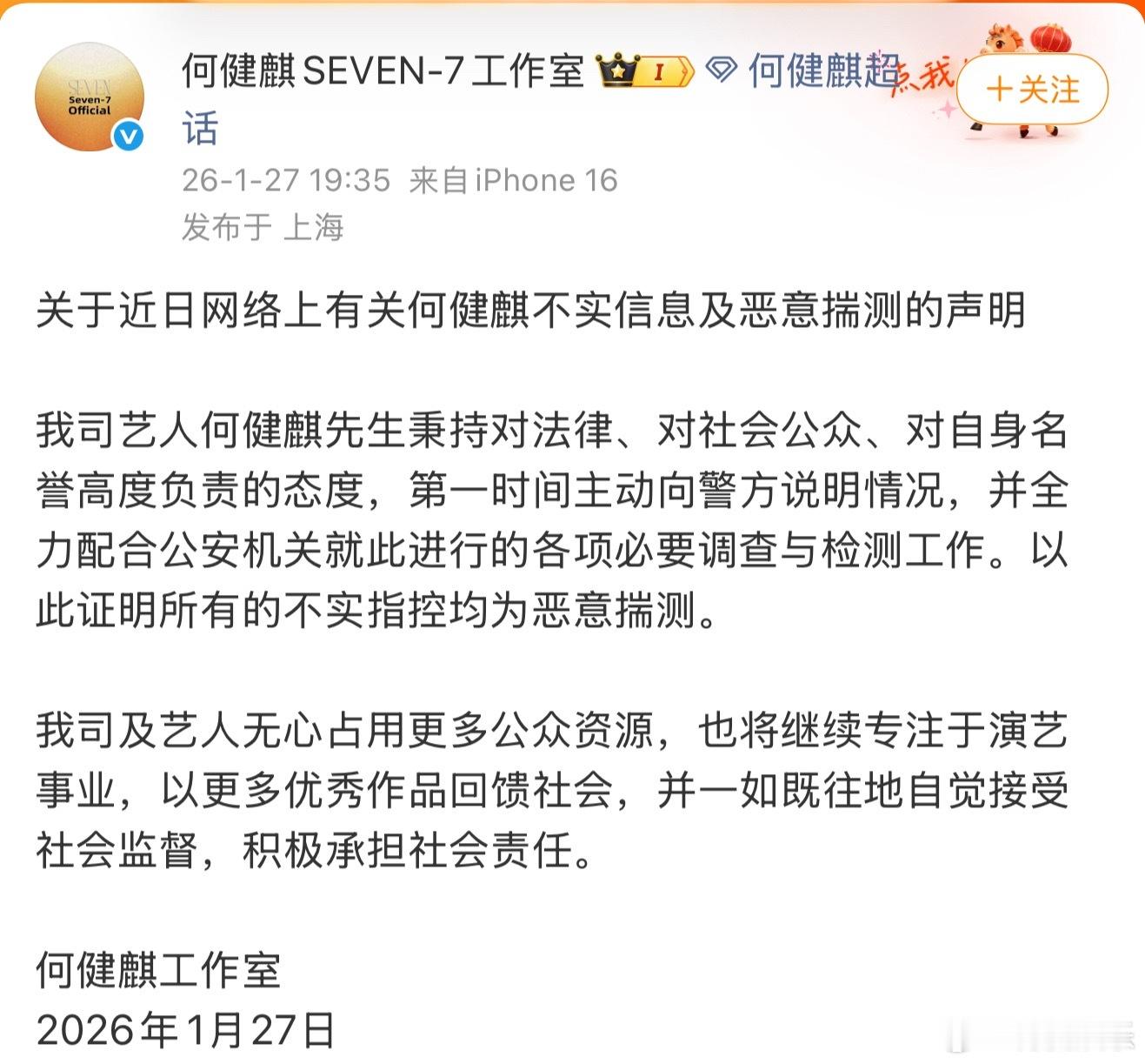 何健麒公开无犯罪记录证明 27日,公开的无犯罪记录证明,证明显示何健麒在1995年2月26日至2026年1月25日期间,未发现有犯罪记录。此前,自称为何健麒前女友的网友实名举报何健麒涉毒,何健麒方表示已报案,并完成了尿检和发检。 何健麒
