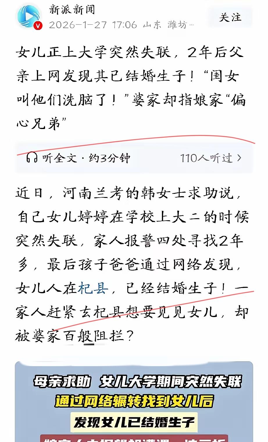 这种女儿不要也罢!河南兰考,大二女生突然失联,家人苦苦寻找,两年后竟在网上偶然发现,她已经结婚还生了孩子。父母赶紧赶到女孩婆家,想要把她接回来,谁知女孩却死活不愿意。女孩公公表示:孩子说母亲对她不好,偏心兄弟,她一辈子都不想回娘家。女孩母亲满肚子委屈:家里是穷,但我一碗水端平,我姑娘就是叫你们洗脑了! 婆家看似护着儿媳,实则放任她断绝亲情,亲妈重病想相见,还被质疑照片造假,这哪里是护着,分明是把隔阂越拉越远。说到底,这不是简单的偏心与记恨,而是穷人家的亲情,少了好好沟通的温度,父母的爱藏在付出里却不会表达,孩子的委屈憋在心里却不愿诉说,最后闹得两败俱伤。血浓于水从不是空话,可亲情也经不起冷待和猜忌,就算有隔阂,亲妈重病的那一刻,也该放下执念,别让遗憾刻进余生!