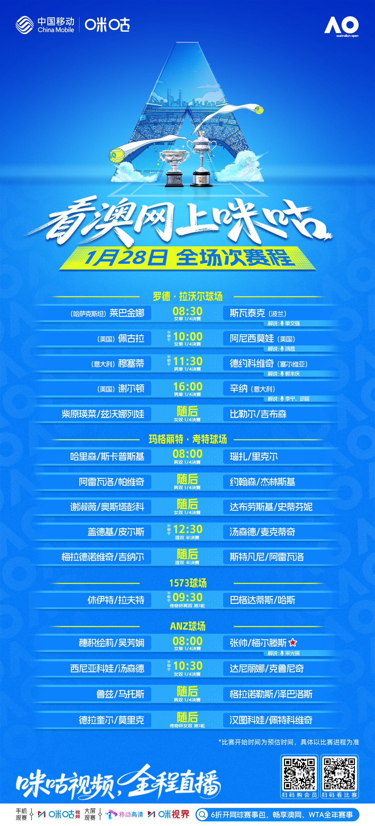 #看2026澳网上咪咕# 1月28日赛程🥂 男、女单四强席位落定💪 张帅/梅尔滕斯冲击女双半决赛🍄 1月28日8:00起 咪咕视频直播👉 网页链接