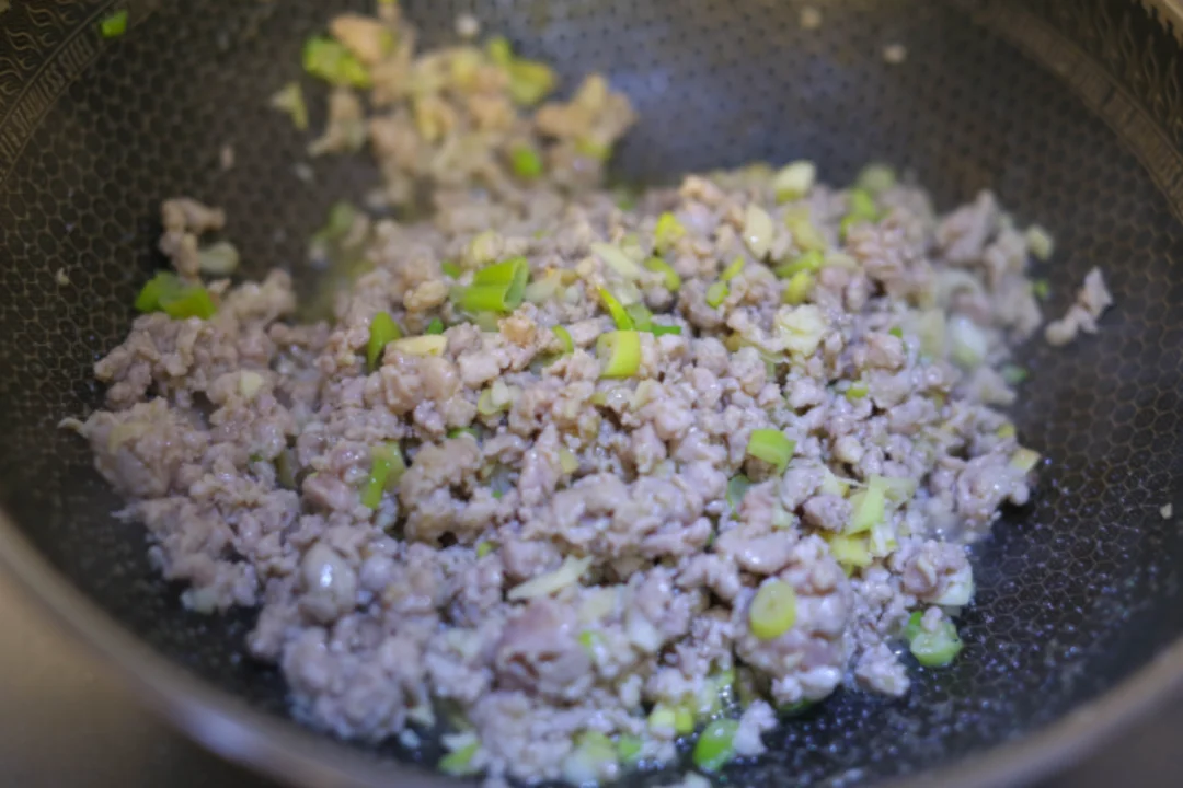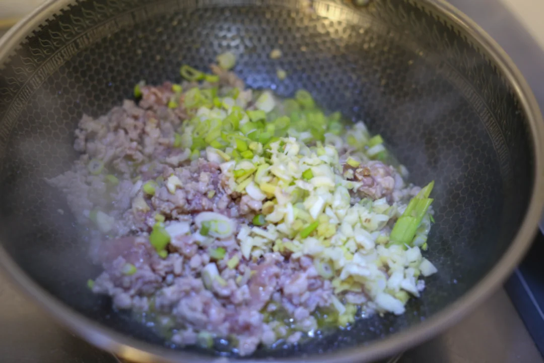 将猪肉剁成米粒小丁,葱切成葱花、蒜切片、姜切末。