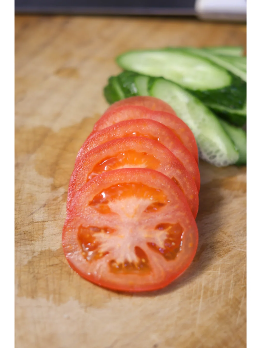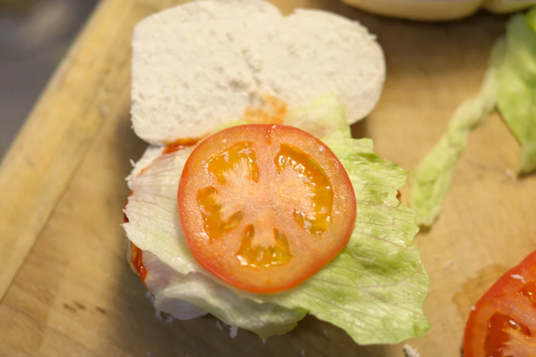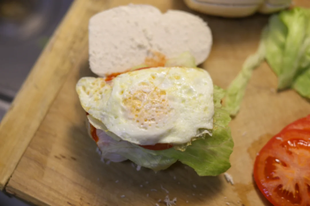 中式汉堡搭配的食材可以根据自己的喜好来选择,我用的是圆火腿、西红柿、黄瓜片、芝麻菜、煎蛋,奶酪片、蕃茄酱。