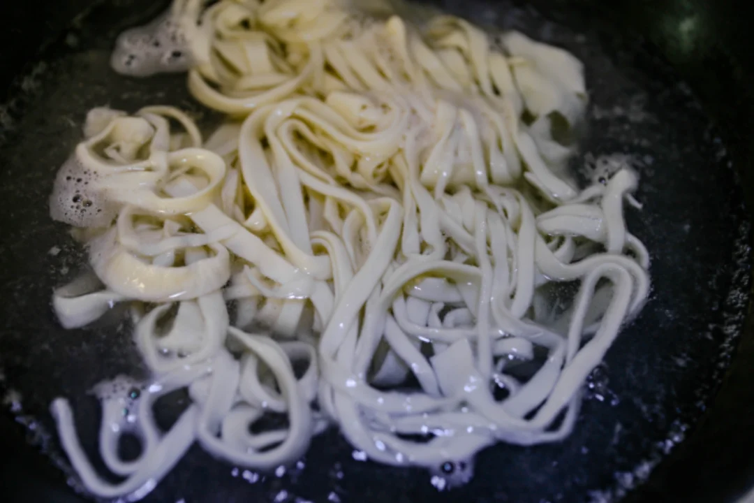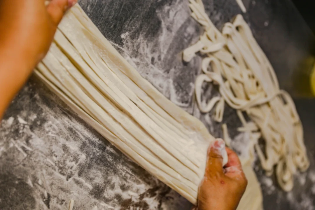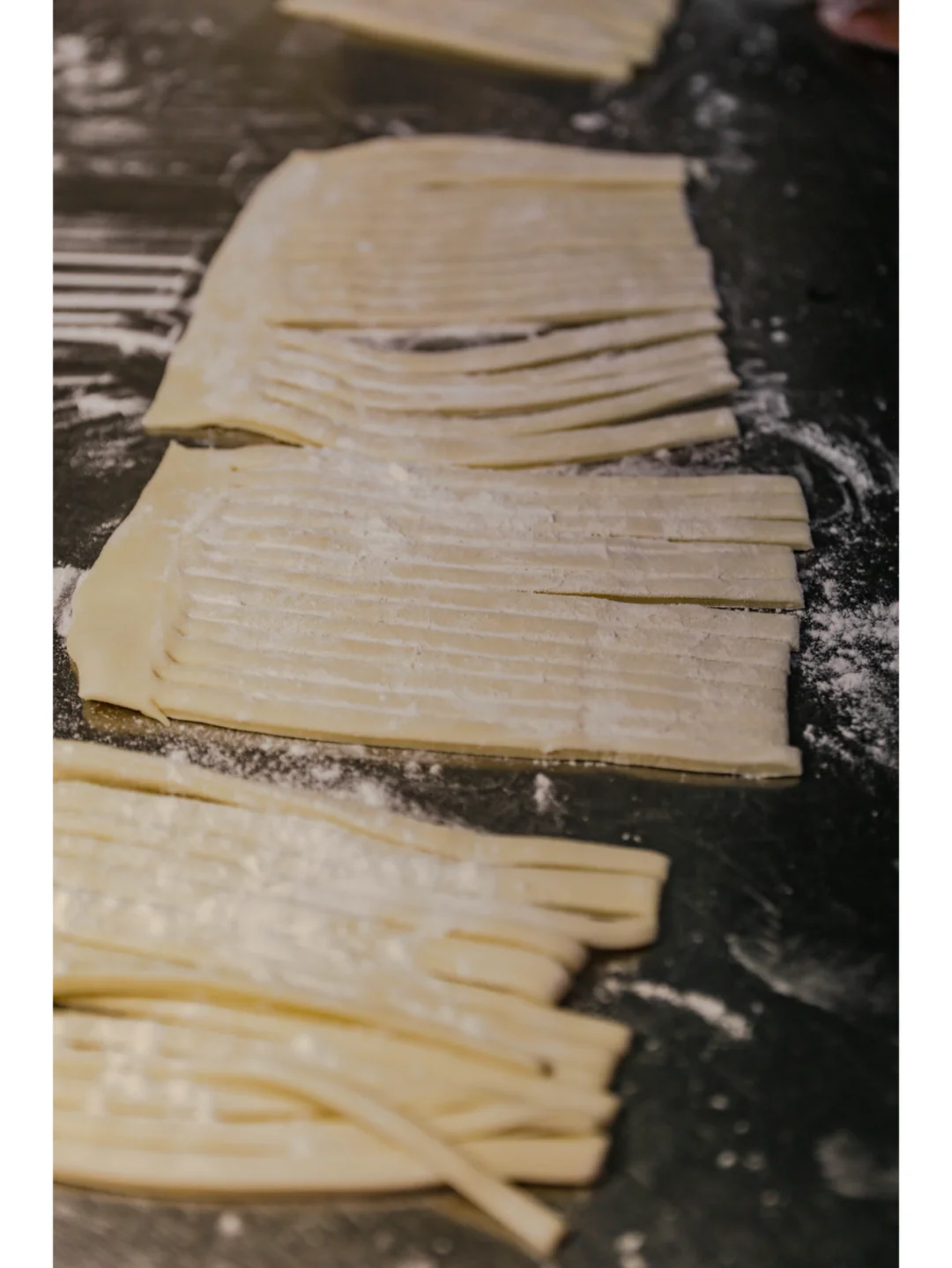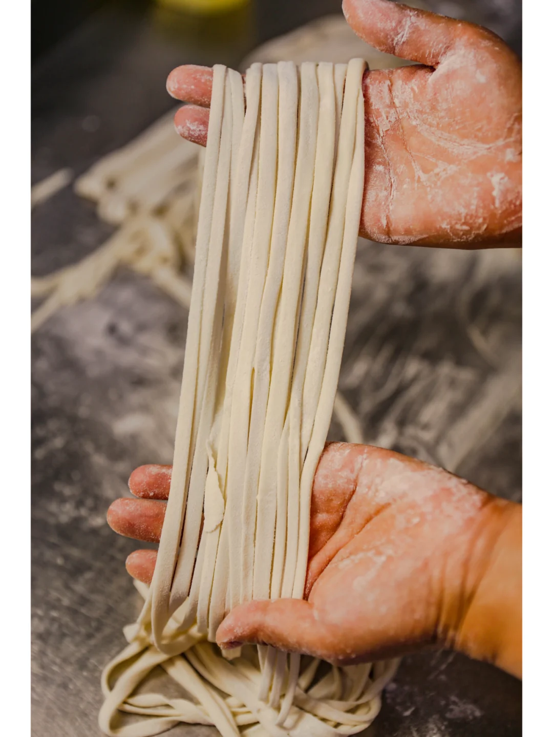 然后在切好的面上撒上一些补面,用手捏住两端,慢慢往两边抻,就可以完美拉出非常筋道的面条了~