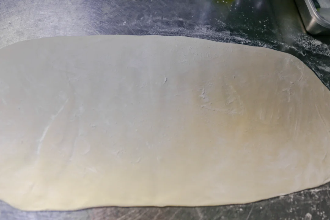 时间到了之后,用擀面杖擀成长方形面片,然后折叠起来,用刀切成长条,不要切断。