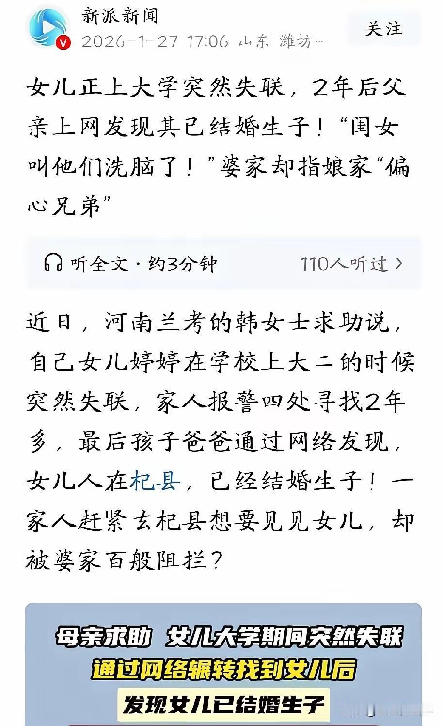 这种女儿不要也罢!河南兰考,大二女生突然失联,家人苦苦寻找,两年后竟在网上偶然发现,她已经结婚还生了孩子。 父母赶紧赶到女孩婆家,想要把她接回来,谁知女孩却死活不愿意。婆家还说女孩家里偏心,女孩母亲满肚子委屈:家里是穷,但我一碗水端平,我姑娘就是叫你们洗脑了! 河南兰考的一个普通家庭河南兰考的一个普通家庭里,两年多来始终笼罩着一层阴霾。家里的女儿正在读大二,本该在校园里安心求学的年纪,却毫无征兆地断了所有联系,像人间蒸发一样没了踪迹。 自从女儿失联后,父母的生活彻底被打乱。他们四处打听消息,报警求助,发动所有亲友帮忙寻找,跑遍了女儿可能去的每一个地方,却始终没有任何线索。 无数个夜晚,母亲翻着女儿的旧照片以泪洗面,父亲则整夜难眠,一遍遍回忆女儿失联前的点滴细节,生怕错过任何蛛丝马迹。家里的气氛压抑到了极点,每一次毫无结果的寻找,都让这对父母的希望破灭一分。 就这样苦苦煎熬了两年,一次偶然的机会,父亲在网上浏览信息时,一张熟悉的面孔突然映入眼帘。 仔细辨认后,他又惊又喜,那竟然是失联已久的女儿!可让他始料未及的是,照片里的女儿身边站着陌生的男子,怀里还抱着一个婴儿,配文显示她已经结婚生子,生活在另一个城市。 这个发现让全家人既激动又困惑,他们立刻根据网上的线索,辗转找到了女儿的婆家。见到日思夜想的女儿,母亲忍不住红了眼眶,快步上前想要拥抱她,却被女儿下意识地躲开。 当父母提出要带她回娘家时,女儿的态度异常坚决,头也不回地拒绝了,脸上没有丝毫对家人的思念,只有疏离与抗拒。 女儿的公公见状,向这对远道而来的父母道出了缘由。据他所说,女儿之所以不愿意回娘家,是因为心里积压了太多委屈, 她觉得母亲从小就对她不好,处处偏心兄弟,这么多年来一直过得很压抑,甚至扬言一辈子都不想再踏回娘家的门。 这番话让母亲瞬间红了眼眶,满肚子的委屈无处诉说。她哽咽着解释,家里条件确实不好,日子过得紧巴巴,但对待一双儿女从来都是一碗水端平,从来没有偏心过谁。 她实在想不通,自己辛辛苦苦拉扯大的女儿,怎么会有这样的想法,只觉得女儿是被婆家洗脑了,才会如此绝情。 一边是女儿坚定的拒斥,一边是母亲委屈的辩解,双方各执一词,原本该是亲人团聚的场景,却充满了无法化解的隔阂。 看着女儿怀里懵懂的孩子,父母心里五味杂陈,既心疼女儿这些年的经历,又寒心她对家人的冷漠。 他们实在不明白,究竟是怎样的误会,让女儿宁愿隐瞒所有人,悄悄结婚生子,也不愿与家人联系。 这段家庭矛盾的经历被分享到网上后,很快引发了全网热议。不少网友对这对父母的遭遇表示同情,觉得女儿的做法太过绝情,无论如何都不该对家人如此冷漠; 也有网友提出不同看法,认为原生家庭的伤害往往深埋心底,子女选择逃离必然有不为人知的原因,不能简单用“绝情”来评判。 如今,“断亲”成为越来越多人热议的话题,背后折射出的是原生家庭的沟通困境与情感隔阂。在很多家庭中,父母自以为的“为你好”,未必是子女想要的; 而子女感受到的“不公平”,也可能是父母未曾察觉的疏忽。亲情本该是世间最温暖的羁绊,却常常因为缺乏理解与沟通,变成彼此伤害的根源。 这对父母最终没能说服女儿回家,只能带着满心的失落与牵挂离开。他们不知道,这场跨越两年的隔阂,何时才能真正化解,也不知道女儿心中的结,是否还有解开的一天。 而类似的家庭矛盾,在现实生活中并不少见,如何平衡亲情中的爱与边界,如何化解深埋心底的隔阂,成为了许多人需要面对的课题。 对此,你们有什么看法,欢迎评论留言~
