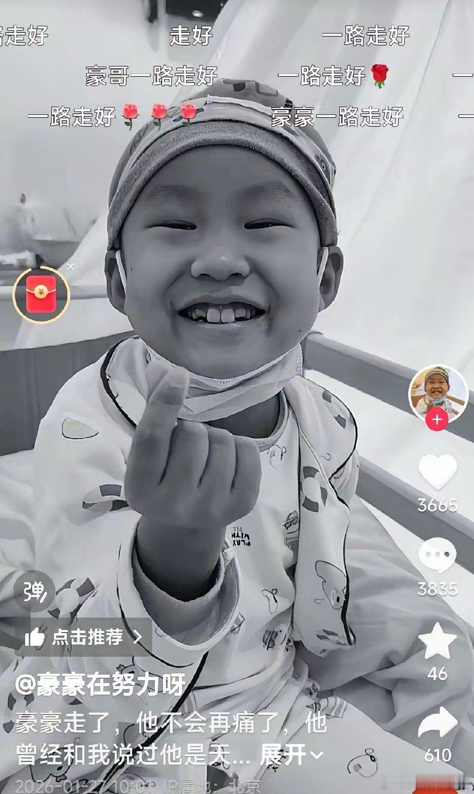 天啦!哭死!豪豪妈妈发视频说豪豪去世了,27日凌晨去世的!从1月12日被医生劝放弃治疗到去世才短短半个月!这半个月应该是豪豪生病以来最幸福的时刻了,他终于想吃什么就吃什么。想打游戏就打游戏,不用每天吃苦苦的药,不用每天扎针,从医生委婉的说出放弃治疗那一刻,他的父母就知道陪伴孩子的时间不多了!豪豪在临走的前一天晚上还抱着妈妈亲妈妈,他一直昏睡不醒,迷迷糊糊的对妈妈说他好痛苦!如今豪豪去了另一个世界他终于不用再被病痛折磨了!愿另一个世界的他健康快乐!