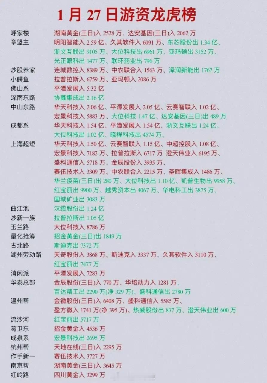 1月27日周二,一线游资龙虎榜【陈小群】持仓未动【章盟主】买入:明阳智能 2.59y 久其软件 6091w卖出:东芯股份 1.34y 浙文互联9106w 大位科技 6961w 亚玛顿 3152w 光正眼科 1477w 联环药业 796w【炒股养家】买入:连城数控 8389w 中农联合 1563w卖出:泽润新能 1767w【中山东路】买入:华天科技 2.06y 平潭发展 2.05y 云赛智联 1.02y 宏景科技 5883w卖出:大位科技 1.47y 达安基因 三日489w【成都系】买入:华天科技 1.54y 平潭发展 1.54y 卖出:浙文互联 1.24y 大位科技 1.02y 晓程科技 4574w【消闲派】买入:平潭发展 7283w【作手新一】买入:赛伍技术 3727w动向总结:今天游资动作统一,抢筹平潭,华天,在车上的应该能爽吃,不过市场整体的赚钱效应太差,没有什么更好的新主线,游资们也只好炒冷饭,这个时候控制仓位等着就行。