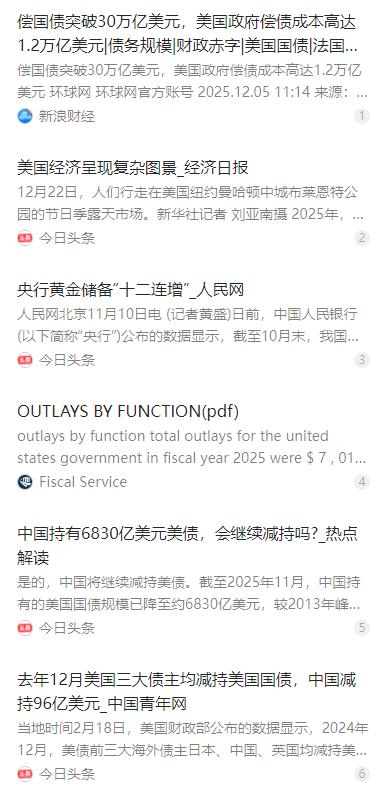 为何中国不能一下把美债全卖了?就这么说吧,中国今天敢全抛售,明天中美就有可能开战,因为中国手里的美债早就不是一张张普通的债券,更像是一根拿在手里的“金融核按钮”。 麻烦看官老爷们右上角点击一下“关注”,既方便您进行讨论和分享,又能给您带来不一样的参与感,感谢您的支持! 中国手里的美债,打从一开始就不是单纯的理财资产,最初大量买入是为了做好外汇储备管理,保障国际支付和金融稳定。如今中美博弈不断加剧,这部分美债更是成了重要的金融博弈筹码,要是真的一次性抛售,必然会被美国视作极端的对抗行为。 当下美国的债务窟窿早已越捅越大,截至 2025 年 12 月,美国联邦总债务规模已经突破 38.4 万亿美元,远超此前的 36 万亿美元。债务高企的同时,美国的偿债压力也在剧增,2026 年美债利息支出预计超 1.1 万亿美元,并非此前预估的 1.3 万亿美元。 2025 财年美国的国防开支为 9166 亿美元,也不是 8950 亿美元,即便如此,美债的利息支出也已经超过了军费开支,成为美国财政的一大重担。中国在 2024 年 12 月持有美债 7590 亿美元,若此时一次性抛售,会对美国金融市场形成重磅冲击。 这种级别的抛售会引发美债价格暴跌、收益率飙升,进而推高美国的整体融资成本,堪称一次金融 “核打击”。但与此同时,中国也会面临持有的美债资产在短时间内严重缩水的后果,最终落得个两败俱伤的下场。 美国向来擅长将美元体系武器化,这一点早已被现实印证。乌克兰危机升级后,美国联合西方国家冻结了俄罗斯的外汇储备,还将俄罗斯多家主要银行排除在 SWIFT 系统之外,让俄罗斯的跨境贸易结算陷入困境。 除此之外,美国还曾无故冻结阿富汗中央银行的外汇储备,让本就陷入困境的阿富汗雪上加霜。这些行为让包括中国在内的诸多国家对美元体系的安全性心存戒备,也让中国意识到不能过度依赖美元资产。 但现实情况是,中美经济在全球产业链中深度捆绑,双方的贸易、投资往来密切,牵一发而动全身。如果中国选择用抛售美债这种极端手段对抗美国,必然会引发美国的强力反制,无论是贸易制裁还是金融限制,都会让中美经济受到重创。 中国当然看到了美债背后的风险,也一直在采取措施对冲风险,逐步减持美债就是最直接的方式。2024 年中国在 12 个月中有 9 个月选择减持美债,全年合计减持规模达 573 亿美元,单月减持最高 227 亿美元、最低 19 亿美元。 这种小步慢走的逐步减持,和一次性清仓式抛售有着本质区别。前者是理性的风险对冲行为,不会对全球金融市场造成剧烈波动,也能让中国平稳降低美债持仓,而后者则是不计后果的极端操作,会引发金融市场的大地震。 中国对美债的减持其实从 2013 年就已经开始,2013 年是中国持有美债的高峰时期,彼时持仓规模达 1.32 万亿美元。此后十多年里,中国一直克制地降低美债持仓,截至 2025 年 11 月,持仓已降至 6830 亿美元,近乎腰斩。 在逐步减持美债的同时,中国也在不断优化外汇储备结构,降低对美元资产的依赖,增持黄金就是重要的一步。截至 2025 年 10 月末,中国央行已经连续 12 个月增持黄金,黄金储备达到 7409 万盎司。 这部分黄金储备在我国官方国际储备中的占比达到 8.0%,虽然这一比例仍低于全球 15% 的平均水平,但持续增持的信号十分明确。黄金是全球公认的避险资产,脱离单一主权货币体系,能有效对冲美元资产的风险。 除了增持黄金,中国还在稳步推进人民币国际化,不断提升人民币在国际贸易、跨境投资中的结算比例。随着人民币跨境支付系统的不断完善,越来越多的国家开始接受用人民币进行贸易结算,这让中国的外汇储备结构更加多元。 中国选择保留一定规模的美债持仓,其实也是一种战略考量。当下中美博弈体现在多个方面,美国动辄就想对中国采取经济施压手段,而保留美债持仓,能让中国在中美经济博弈中握有一定的筹码,牵制美国的非理性行为。 说到底,中国不抛售美债,不是因为不敢,而是因为理性。在复杂的国际格局下,真正的博弈从来都不是逞一时之快,而是谋长远之利。无论是逐步减持美债,还是优化外汇储备结构,亦或是推进人民币国际化,都是中国为保障金融安全做出的长远布局。 美债的本质是美国的国家信用,而美国不断攀升的债务规模,早已让其国家信用大打折扣。中国的一系列操作,既是对美元体系风险的应对,也是在为构建更加多元的国际货币体系贡献力量,这远比一时的意气用事更有意义。