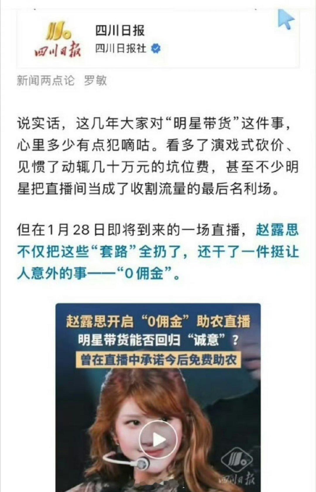 四川日报发文点赞赵露思的0佣金助农直播一事了,论迹不论心,真的只要是助农了,都值得大家的夸赞啊
