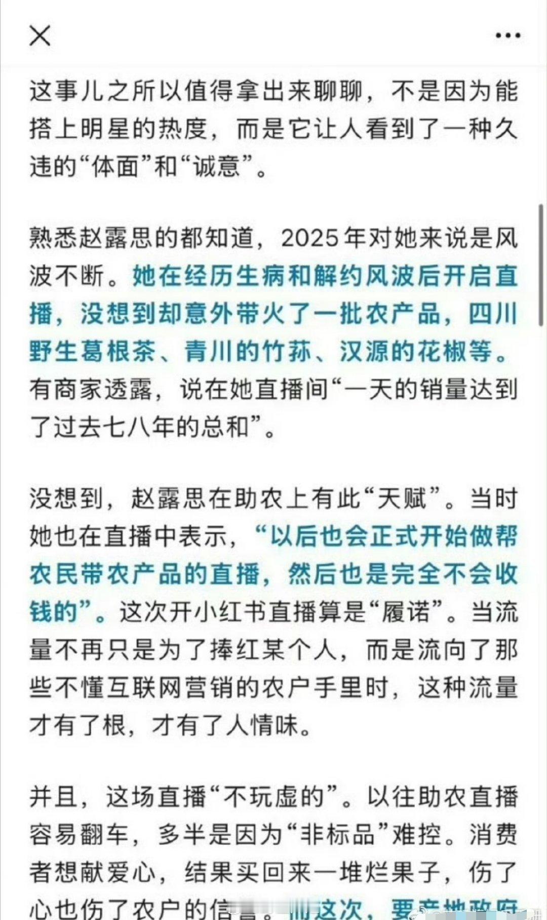 四川日报发文点赞赵露思的0佣金助农直播一事了,论迹不论心,真的只要是助农了,都值