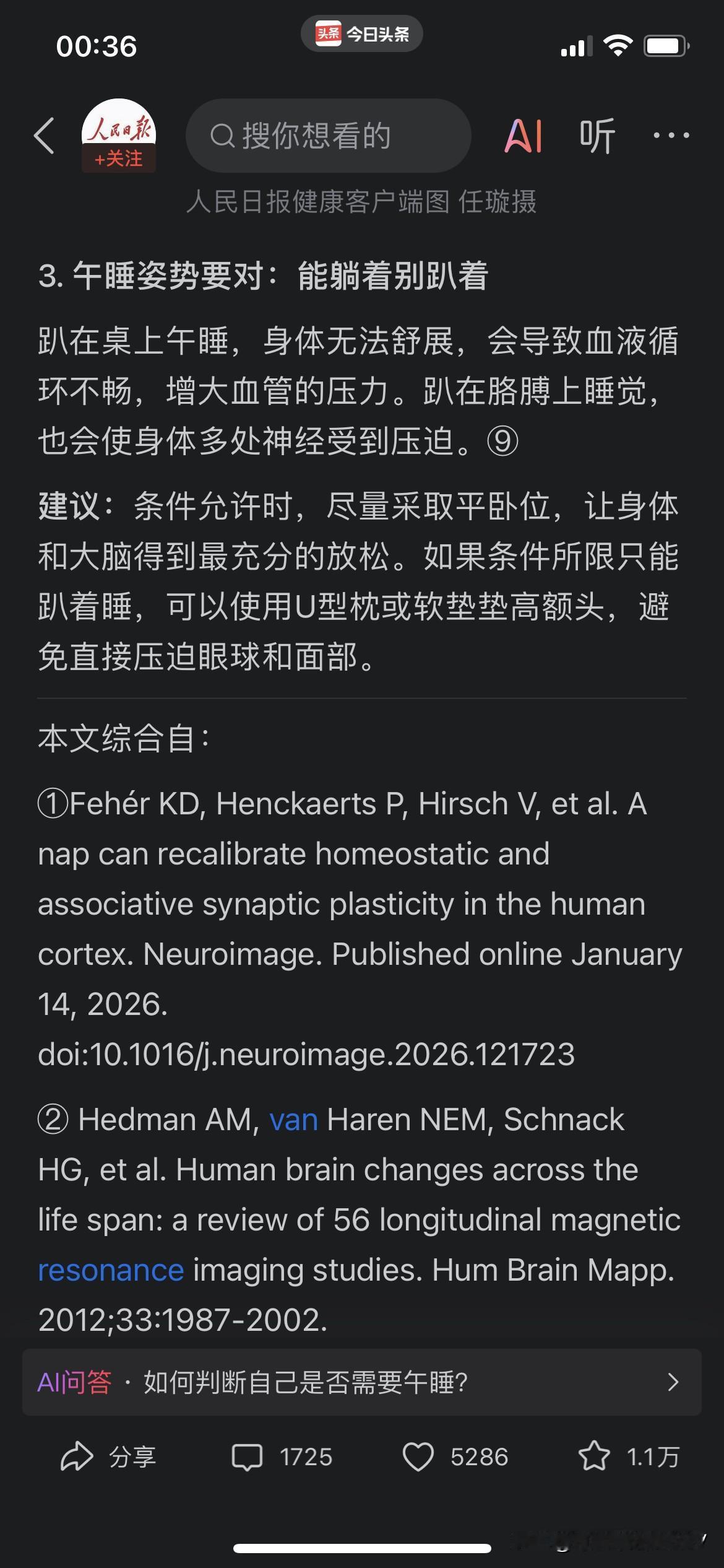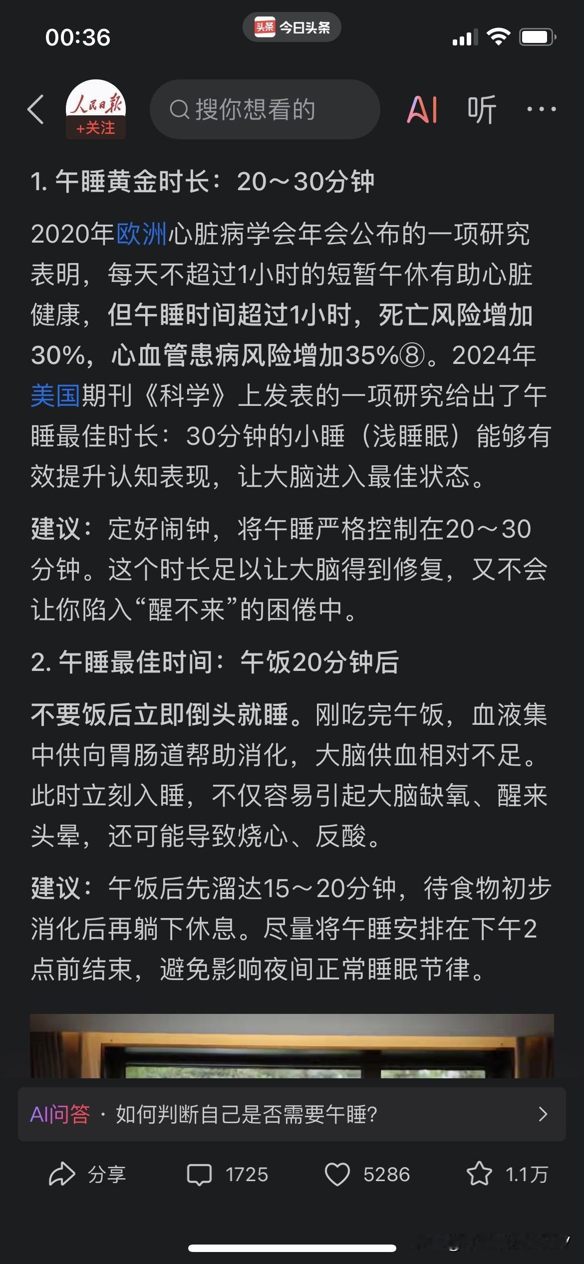 都说午睡半小时,可延缓衰老,还真不是瞎扯。午睡好处多多,能让精力充沛、保护大脑、提高记忆力,还能刺激淋巴细胞、改善免疫力。 睡眠是周期性变化的,成人睡眠周期约90分钟,40分钟后易进入深睡眠,睡久了反而疲倦。2024年有研究显示,高血压患者午睡超30分钟,中风风险增加;午睡超1小时,死亡和心血管患病风险也会上升。 另外,别吃完饭就睡,建议饭后20分钟再睡,也别直接趴桌,能平卧最好。调好闹钟,睡上半小时,一起延缓衰老!