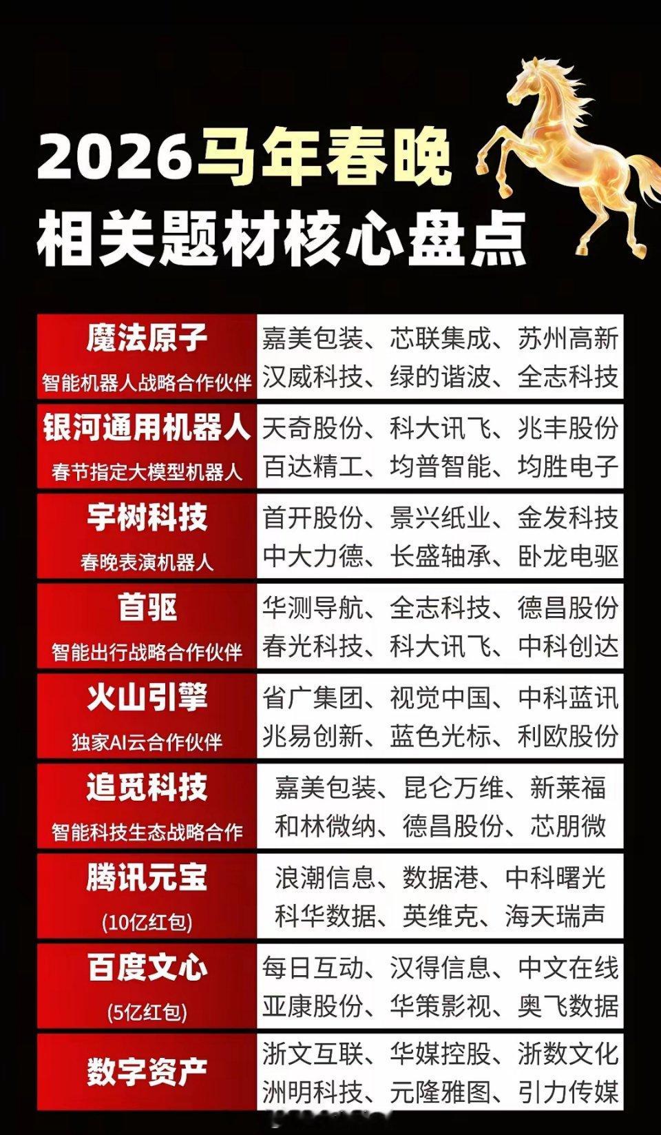 马年春晚带火的科技风口,谁能接住流量变成长?当2026马年春晚的舞台上,魔法原子、宇树科技的机器人翩翩起舞,火山引擎的AI特效惊艳全场时,这场全民盛宴早已不止是娱乐,更成了中国硬科技实力的“年度发布会”。从银河通用机器人成为春晚指定大模型伙伴,到追觅科技的智能生态登上舞台,资本的嗅觉比观众的掌声更敏锐——那些出现在春晚合作名单里的上市公司,正在被重新定义价值。这股春晚科技旋风的背后,是全球AI产业从“实验室落地”到“场景爆发”的关键转折。OpenAI的Sora视频生成技术正在重构内容生产逻辑,而国内火山引擎的实时渲染技术已支撑起春晚8K直播的亿级流量,视觉中国、蓝色光标等内容生态企业借势完成AI商业化的场景验证。与此同时,宇树科技的人形机器人在舞台上完成复杂舞蹈动作,背后是绿的谐波、中大力德等核心零部件厂商突破了关节减速器的技术瓶颈,让国产机器人的运动精度达到国际一流水平。这种“技术突破+场景验证+资本加持”的闭环,正在让春晚合作名单变成硬科技企业的“成人礼”。更值得关注的是,春晚科技合作的底层逻辑正在发生质变。过去,企业登上春晚更多是品牌营销行为;如今,火山引擎作为独家AI合作伙伴,其技术能力已成为春晚内容生产的基础设施,兆易创新的存储芯片则支撑着直播流的稳定运行。这种“技术即服务”的模式,让科技企业不再是舞台的“配角”,而是内容生产的“主角”。同样,首驱作为智能出行合作伙伴,其搭载华测导航、中科创达技术的自动驾驶车辆,正在春晚场外完成交通调度的实战演练,这标志着智能驾驶技术从“实验室”走向“生活场”的关键一步。我们需要清醒看到,春晚带来的流量红利只是起点,能否转化为持续增长的动能,取决于企业技术壁垒的厚度。以机器人赛道为例,宇树科技的表演虽然吸睛,但绿的谐波的减速器产能、全志科技的芯片算力,才是支撑行业规模化落地的核心。而在AI内容领域,百度文心、火山引擎的大模型能力,需要通过每日互动、中文在线等生态伙伴,完成从“技术工具”到“商业引擎”的蜕变。当腾讯元宝的10亿红包、百度文心的5亿补贴在春晚发放时,本质是互联网巨头借流量入口,加速AI技术的全民渗透。站在2026年的时间节点回望,马年春晚的科技舞台,更像是中国硬科技产业的“阅兵式”。那些被春晚流量照亮的企业,不仅要接住短期的资本热度,更要在技术迭代中沉淀长期竞争力。毕竟,真正的风口从来不是春晚的聚光灯,而是全球科技竞争的主赛场。当机器人走进千家万户,当AI重构内容生态,今天的春晚合作名单里,或许就藏着下一个十年的科技巨头。