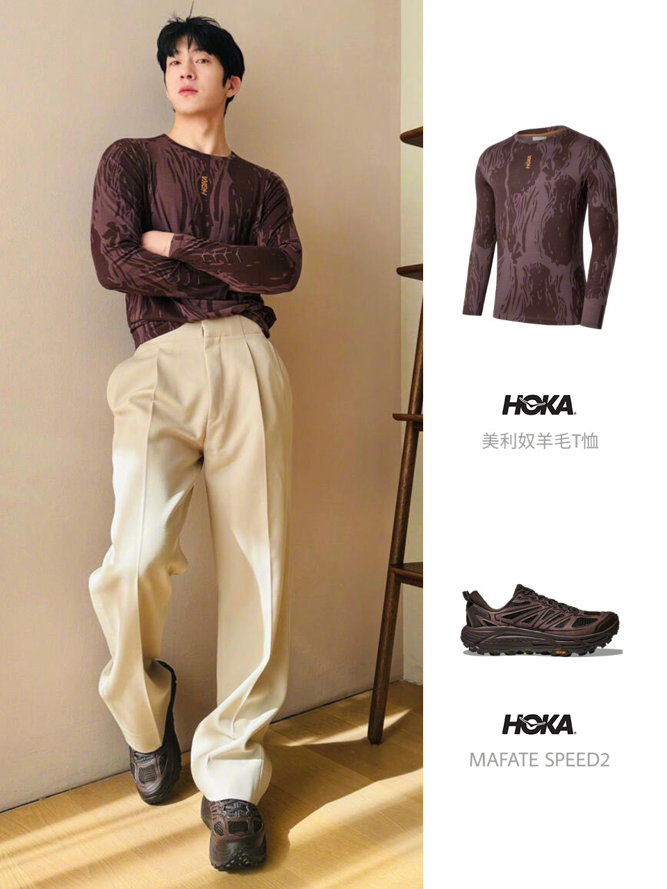 井柏然 in HOKA 📷🐎 作为品牌代言人演绎的马年限定系列,身着棕调印花纹理的长袖T恤,搭配一双同色系的新款MAFATE SPEED 2 TS,松弛表达自我态度之余,单品又兼具功能性与时髦感,完美诠释都市无限风格。新年运动风LOOK的正确打开方式。