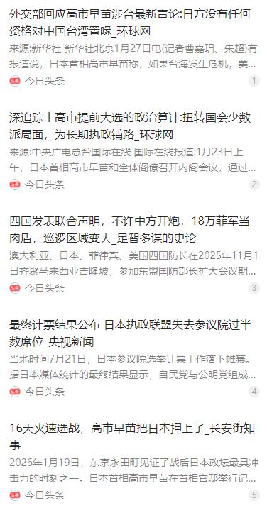 中日一旦开战,中国无需动用核武,只要“一招”,日本自动崩溃。内政危机不断加深后,高市早苗还是选择了拒不撤回错误涉台言论,但另辟蹊径亦愈发明显。这其实说的是高市早苗被曝出在提前考虑解散众议院的重磅消息,众议院大选即将拉开序幕。日媒报道认为,高市早苗似乎希望通过巩固政权基础的方式来扭转日中关系紧张恶化的当下局面,这实际上意味着中日之间爆发战争的可能性仍然居高不下,但我国是占据优势的一方。 麻烦看官老爷们右上角点击一下“关注”,既方便您进行讨论和分享,又能给您带来不一样的参与感,感谢您的支持! 当下的中日关系,因日本右翼势力的不断操弄持续紧张,而作为日本首相的高市早苗,更是这股危险势头的核心推手。她始终拒不撤回涉台错误言论,甚至在 2026 年 1 月直接表态台海危机下美日或联合行动,这番言论遭到中国外交部的严厉驳斥,日方也再次暴露借台海问题推进军事化的野心。 高市早苗的强硬并非毫无来由,其背后是日本国内的政治困局,而她为了破解困局选择的方式,更是让中日冲突风险持续走高。2026 年 1 月 19 日她突然宣布解散众议院,1 月 23 日众议院正式解散,定于 2 月 8 日举行大选,这场提前到来的选举,是她一场豪赌式的政治算计。 高市早苗领导的自民党在众议院仅有 199 席,未达半数,且日本众参两院均处于朝野分控的少数执政局面,这让她的政治议程推进举步维艰。她想借着当前 70% 以上的内阁支持率,通过大选扩大议席,摆脱对执政盟友的依赖,建立稳定的执政政权。 外界都能看出,高市早苗试图用巩固政权的方式,在中日博弈中掌握更多筹码,而非真正想要缓和中日关系。她刻意制造外部威胁的叙事,就是为了凝聚国内右翼和保守势力的共识,让自身的强硬路线获得更多民意支持,这种做法也让中日开战的可能性居高不下。 高市早苗的右翼路线,在日本国内有着明确的同盟者,日本维新会就是她最核心的执政伙伴。自民党与公明党合作破裂后,自民党和维新会结成右翼轴心,二者在安全政策上高度契合,都主张把防卫支出提升至 GDP 的 2% 以上,彻底推翻日本专守防卫的传统。 这两大右翼势力的联手,让日本的修宪、扩军步伐不断加快,同时日本还在积极推进对外军事联动。2025 年 11 月,日本就与美菲澳发布联合声明,强化四方军事合作,还和菲律宾达成互惠准入协议,协助菲方提升海警能力,试图在印太地区形成针对中国的军事布局。 除了联合域外势力,日本还长期在钓鱼岛问题上不断制造争端,多次试探中方的底线,而高市早苗更是突破底线,直接表露日本可能军事介入台海的意图。台湾问题是中国的核心利益,日方的一系列行径,严重冲击了中日关系的政治基础,让中日冲突成为必须正视的现实。 面对日本的步步紧逼,中国并非毫无准备,如今的中国早已具备足够的实力,应对潜在的中日冲突,而且这份实力,无需动用核武就能形成绝对压制。日本想要借外部势力撑腰的想法,在中国的反介入与区域拒止能力面前,根本没有实现的可能。 中国已经迈入三航母时代,海空一体化作战能力得到质的提升,海上防御和作战范围大幅拓展,能够在第一岛链内形成强大的军事威慑。这意味着一旦开战,日本的海上军事力量,根本无法靠近中国周边海域,其本土的海上补给线也会被牢牢掌控。 更重要的是,中国火箭军列装的东风 - 26 等核常兼备中远程弹道导弹,成为了反制外部势力介入的关键力量。东风 - 26 具备精准打击能力,能够覆盖第二岛链内的各类目标,美国在西太平洋的军事基地都在打击范围内,这让美国不敢轻易为日本站台。 海空一体的作战体系,搭配上东风系列导弹的精准威慑,构成了中国应对中日冲突的关键一招。这一招不仅能压制日本的军事力量,更能切断美国的军事支援,让日本陷入孤立无援的境地。日本的经济高度依赖海上贸易,一旦海上通道被封锁,其国内经济将迅速崩盘。 日本的工业生产、能源供应都离不开外部进口,海上航线就是日本的经济生命线,而中国的海空力量完全有能力掌控西太平洋的海上通道。一旦开战,日本的港口、航线会被全面限制,物资无法进,产品无法出,国内的工业体系会迅速瘫痪,民生也会陷入混乱。 高市早苗想借着强硬路线巩固政权,却忽略了日本与中国的实力差距,以及日本自身的致命短板。中国的反介入与区域拒止能力,精准掐住了日本的经济和军事命脉,这也是为何说中日一旦开战,中国无需核武,仅靠这一招,就能让日本自动崩溃。 日本国内并非所有人都支持高市早苗的路线,立宪民主党和公明党组建的中道改革联合,就以民生优先为口号,制衡右翼势力,其背后还有着强大的基层选票支撑。高市早苗的大选豪赌未必能成功,而她推动的对华强硬路线,最终只会让日本付出惨痛代价。