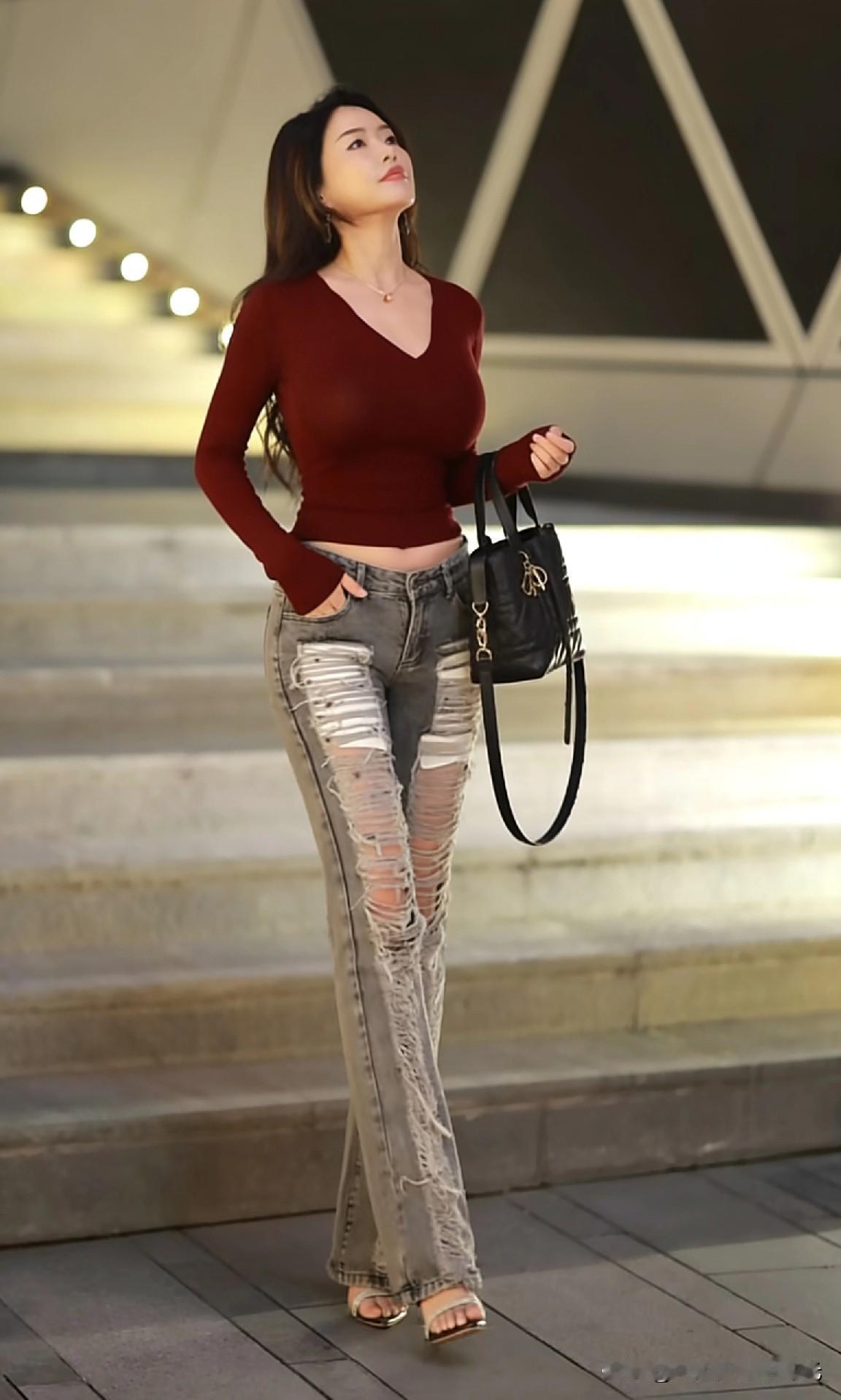 都市时尚女孩,红衣搭配破洞牛仔裤,自信步伐,时尚感爆棚!👗👠👜