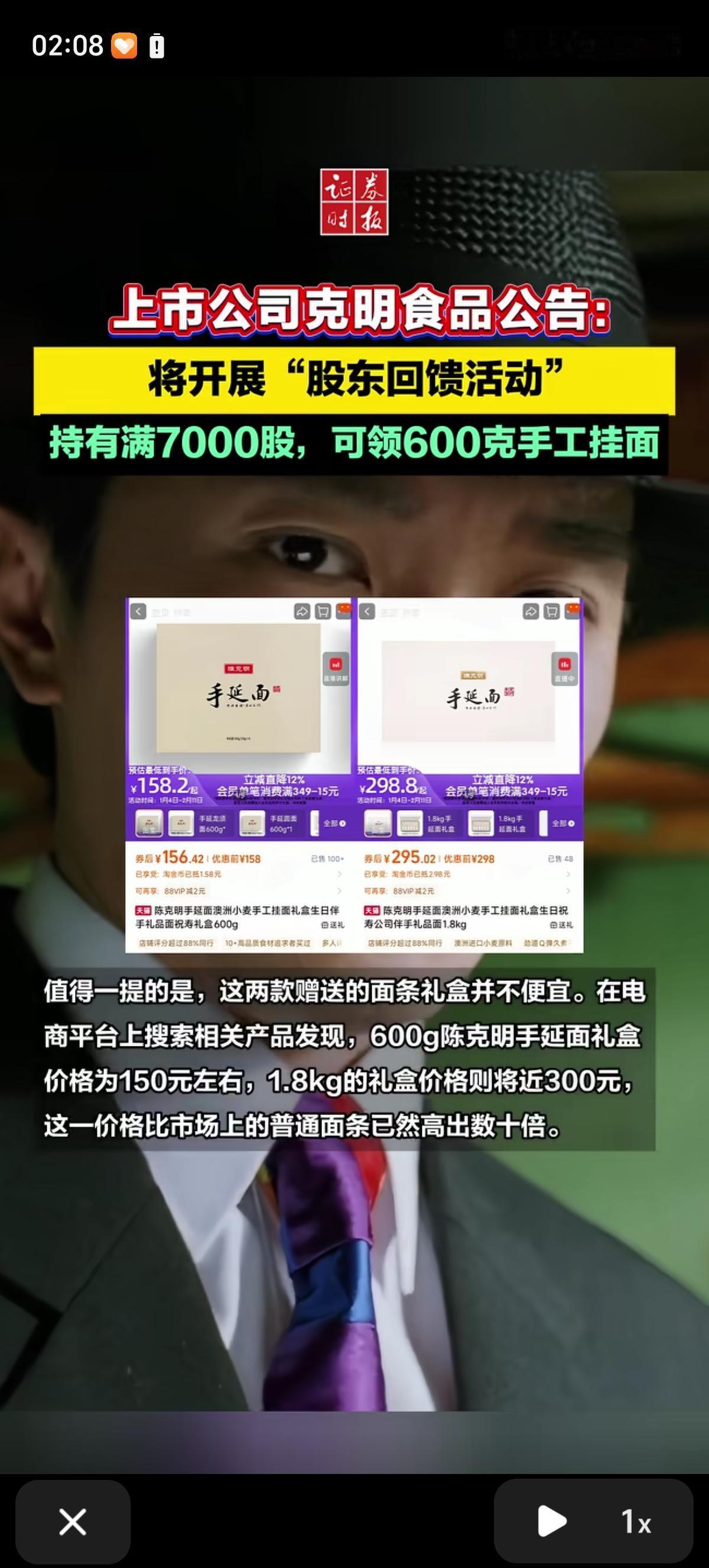 股权换面条,上市公司克明食品宣布持有满7000股可领600克手工挂面,面条是面粉做的,陈克明礼盒值150元。持股1.2万及以上的股东可以免费领取1.8kg陈克明手延面礼盒,礼盒价值将近300元。 申领时间为2026年1月28日8:00至2月6日24:00,逾期视为自动放弃。 果然符合食品公司能干出来的事,果然卖的是陈克明版面条。大过年的请股东吃面条,小心机满满,生怕别人不知道其主营业务是卖挂面的。