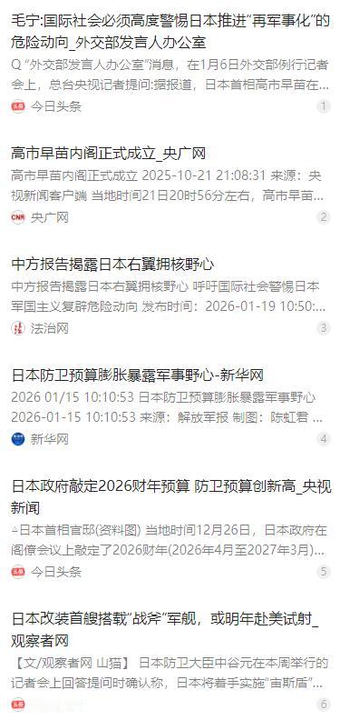 奉劝所有中国人,必须要做好心理准备,因为央视已经说出了事实:“日本想打的不是一般小仗它想打大战”日本大幅增加防卫预算,不断修订“安保三文件”,日本国内认为,高市政府正将日本引向“战争国家”。 麻烦看官老爷们右上角点击一下“关注”,方便您进行讨论和分享,感谢您的支持! 央视的发声点醒了所有人,日本如今的一系列动作根本不是冲着小规模冲突来的,而是一心想要打造能打大战的实力。高市早苗政府上台后,军事扩张的脚步越走越急,不断突破战后的军事限制,大幅抬升防卫预算,接连修改安保相关文件,就连日本国内都直言,这个政府正把日本往 “战争国家” 的方向推。 2025 年 10 月高市早苗内阁正式成立,这个右翼色彩浓厚的政府刚上台就亮出了扩军的鲜明态度,2025 财年的防卫费直接飙到 11 万亿日元,硬生生提前两年实现了防卫费占 GDP2% 的目标。紧接着敲定的 2026 财年防卫预算又突破 9 万亿日元,再创历史新高,这也是日本防卫预算连续多年的大幅攀升。 为了凑齐天价的军费,高市早苗政府不惜动起了民生的奶酪,计划通过加征税收、压缩民生领域投入的方式筹措资金,让日本民众为政府的扩军计划买单。从相关数据来看,日本的军费开支已经实现连续 13 年增长,这样的增长速度和规模,在战后的日本历史上极为罕见。 高市早苗政府把砸进去的军费,重点都用在了打造进攻性战力上,完全抛开了日本战后坚持的 “专守防卫” 原则。单是在导弹升级和相关打击能力建设上,就投入了 9733 亿日元,一边推进国产远程导弹的研发量产,一边落实对美国战斧巡航导弹的采购和部署。 日本还在加紧对宙斯盾驱逐舰进行改装,让其具备发射战斧巡航导弹的能力,首批改装舰计划 2026 年 3 月底前形成相关能力。同时对出云号、加贺号两艘准航母进行改造,计划 2027 年让其形成实战能力,海上进攻能力将得到质的提升。 在军事布局上,日本也在不断调整架构,不仅把航空自卫队更名为航空宇宙自卫队,新设宇宙作战集团,还将冲绳那霸市的陆上自卫队第 15 旅团升级为师团,向西南诸岛大幅增兵,针对性的军事部署意图十分明显。 更让人警惕的是,高市早苗政府还在试图突破核限制,一边着手修订 “安保三文件”,一边对日本坚持多年的 “无核三原则” 动歪心思。政府高层不仅在国会中对坚守 “无核三原则” 含糊其辞,还公然探讨修改其中条款,甚至有高官叫嚣日本应当拥有核武器。 日本的这一系列扩军行为,彻底违背了《开罗宣言》《波茨坦公告》等具有国际法效力的战后准则,这些文件明确规定日本应完全解除武装,不得维持能使其重新武装的产业。中国外交部发言人毛宁也明确表态,直指日本加速再军事化的危险动向值得国际社会高度警惕。 毛宁还直言,日本右翼势力惯于伪装,炮制虚假叙事渲染紧张,以防卫为借口把民众绑上战车,这种手法和历史上的日本军国主义并无二致。中国和全世界爱好和平的国家与人民,绝不会允许日本右翼势力开历史倒车,绝不允许军国主义死灰复燃。 高市早苗政府的激进扩军举动,不仅遭到国际社会的警惕和反对,在日本国内也引发了强烈的不满和抗议。长崎、广岛这些曾遭受核打击的城市,坚决反对政府修改 “无核三原则”,新潟等多地的民众自发举行集会,抗议政府的扩军计划。 日本的前首相石破茂、岸田文雄等人也纷纷公开发声反对,多个在野党更是直言谴责高市早苗政府的行为,认为这种不计后果的扩军,正在让日本面临前所未有的战争风险,是把整个国家推向危险的边缘。 高市早苗政府之所以敢肆无忌惮地推进扩军,背后有着多重原因。首要的就是日本国内右翼势力的联合抱团,这些势力一直抱有复活军国主义的野心,高市早苗的上台让他们有了推进相关计划的机会,各项扩军动作也因此密集出台。 而美国的默许和支持,更是给了日本右翼势力底气。美国为了牵制亚太地区的相关国家,不断放松对日本的军事限制,甚至和日本制定 “延伸威慑” 指导方针,对日本的扩军行为睁一只眼闭一只眼,成为日本背后的推手。 高市早苗政府还打着靠军工产业拉动经济的算盘,试图通过大规模的军事投入,带动相关产业发展,可这种做法被外界普遍认为是饮鸩止渴。军事投入的巨额资金本就来自民生和税收,过度发展军工只会让日本的经济结构愈发畸形,最终反噬自身。 军事评论员也一针见血地指出,日本的扩军计划,本质上是妄图配合美国开展亚太乃至全球的军事行动,成为美国在亚太的 “军事马前卒”。可日本的右翼势力完全忽视了历史教训,忘记了军国主义曾给日本和周边国家带来的深重灾难。 作为邻国,中国必须做好充分的心理准备和应对准备,看清日本扩军背后的真实野心。同时我们也要坚定立场,和全世界爱好和平的国家与人民一道,坚决捍卫战后国际秩序,警惕和遏制日本军国主义的复辟,守护地区的和平与稳定。