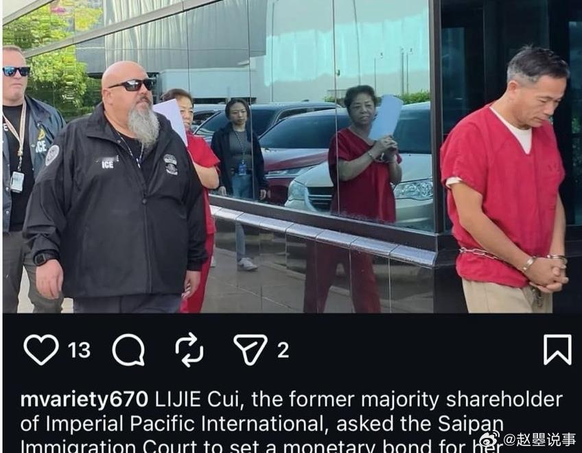 68岁的女人,戴着手铐,穿着亮红色的囚服,站在异国他乡的法庭上。 当镜头对准她时,她没有低头,没有闪躲,反而扬起下巴,熟练地用手中的文件挡着脸,嘴角甚至还挂着一丝从容的微笑。她是崔丽杰,女星吴佩慈的“婆婆”,曾经身家百亿的“塞班赌场女王”。 这一天,她在美国塞班岛的移民法庭上,投下了两颗炸弹:第一,她已秘密再婚,丈夫是比她小28岁的美国籍下属;第二,她当庭宣布,与自己的亲生儿子、吴佩慈的男友纪晓波“毫无关系,没有联系”。崔丽杰这次被美国移民与海关执法局(ICE)从塞班岛机场带走,直接原因是她手持的E-2C长期投资人签证逾期了。 这种签证要求投资必须持续运营并创造就业,而她旗下的博彩帝国早已停摆。 为了不被遣返,她在法庭上亮出了自己的“新王牌”,一本结婚证。 丈夫名叫Howyo Chi,是她的下属,比她年轻整整28岁。这场婚姻登记于2024年10月,正是她旗下“博华太平洋”公司申请破产后不久。 律师提交了厚达上百页的材料,包括水电费账单、居住证明,极力证明这段婚姻的真实性,并以此为由申请绿卡,企图将非法滞留的身份“洗白”。 然而,这种在关键时刻、与年轻下属的婚姻,迅速引起了移民局的警觉和调查。从赤脚医生到“塞班女王”,崔丽杰的人生剧本堪称草根逆袭的极限版本。 她出生在哈尔滨,早年做过赤脚医生,也在单位看守过仓库。 90年代,她带着仅有的2万元本金,凭借过人的胆识和商业嗅觉南下闯荡。她的第一桶金来自大连的KTV和游戏厅生意,随后与儿子纪晓波转战澳门,切入博彩中介的灰色地带,以“叠码仔”业务迅速积累起惊人财富。 真正的转折点发生在2014年,崔丽杰家族收购了香港上市公司“博华太平洋”,并一举拿下美国塞班岛为期40年、且唯一的综合性赌场度假村开发牌照。 他们描绘的蓝图极其宏伟:总投资31亿美元,打造“东方拉斯维加斯”。那几年,是崔丽杰家族最高光的时刻。 她的儿媳、女星吴佩慈,尽管一纸婚书迟迟未得,却以惊人的“孝心”稳固地位。 2017年,吴佩慈豪掷近10亿人民币,聘请欧洲珠宝工匠,打造了两条镶嵌了250万颗施华洛世奇水晶的巨龙,作为送给婆婆塞班岛“博华皇宫·塞班”酒店的开业贺礼。 巨龙长度堪比英国伦敦眼摩天轮,极尽奢华之能事,被媒体争相报道。 崔丽杰稳坐幕后,被外界冠以“东北商业教母”、“塞班赌场女王”的称号,风头无两。然而,这座用巨额资本和复杂人际关系堆砌起来的帝国,地基并不牢固。 塞班岛项目从启动之初就丑闻缠身。 先是爆出非法雇佣大量持旅游签证的中国籍建筑工人,工作条件恶劣;接着又被指控在施工中违反安全条例,存在严重贿赂当地官员的行为。 这些操作,为日后的大崩塌埋下了致命的雷。2020年,全球疫情重创旅游业和博彩业,塞班岛的赌场被迫关停,现金流彻底断裂。 真正的致命打击来自2023年,中国内地司法机关通报,以纪晓波为首的恶势力犯罪集团,长期在澳门从事非法放贷、暴力催收等违法犯罪活动。 纪晓波的姨母、崔丽杰的妹妹崔丽梅已在内地依法获刑。 纪晓波本人则被列入通缉名单,自此下落不明,音讯全无。到了2024年,曾经市值百亿的“博华太平洋”最终走向破产。 根据法庭文件,公司负债高达1.658亿美元,而其塞班岛的资产,包括那未完工的豪华酒店,估值已大幅缩水。 正是在公司申请破产的这个当口,2024年10月,崔丽杰与她的美籍下属登记结婚。 商业帝国的崩塌,与个人身份的重组,在时间线上形成了刺眼的对照。这也解释了,为何在塞班岛的移民法庭上,当法官问及她儿子纪晓波的下落时,崔丽杰会给出如此决绝的回答。 她斩钉截铁地声称“没有联系”、“不知道他在哪”,与儿子进行彻底的“切割”。这种反常的表态,在外界看来,是一种在绝境中极其冷静的战术选择。 儿子已被通缉,家族企业已然破产,昔日的商业盟友纷纷散去。 此时,承认关联不仅毫无益处,反而可能引火烧身,让她本就艰难的移民官司雪上加霜。 与其被捆绑沉没,不如果断割缆,为自己争取一丝喘息的空间。 血缘亲情,在巨大的法律风险和生存压力面前,显得无比脆弱。这场风波中,另一个被反复提及的名字是吴佩慈。 她为纪家生下两儿两女,却始终未能踏入婚姻殿堂,过去常年被媒体嘲讽“豪门梦碎”。 然而,当纪家的商业和法律巨浪袭来时,这缺失的一纸婚书,却意外地成为了一道“防火墙”。 由于没有法律上的婚姻关系,纪晓波及其家族的债务与法律纠纷,在很大程度上无法直接牵连到吴佩慈。 她早年用纪家资金购置的香港顶级豪宅,据传早已转入自己名下。 如今,她带着孩子们安静生活,与塞班岛法庭上的手铐、破产文件以及那场充满疑问的“老少恋”,仿佛处于两个平行的世界。 昔日的“遗憾”,在惊涛骇浪中,竟成了某种程度的“幸运”。崔丽杰的故事,是一个关于野心、财富、阶层跨越与急速坠落的故事。 她从中国东北的仓库,一路走到太平洋岛屿的赌场王座,最后又跌落到移民法庭的被告席上。 她用一场突然的婚姻做最后一搏,并在法庭上亲手划清了与至亲的界限。 所有的繁华、亲情、算计与挣扎,都浓缩在了塞班岛法庭上那抹复杂的微笑里。 她的下一次听证会定在2026年1月27日,那本结婚证能否换来自由,仍是未知数。