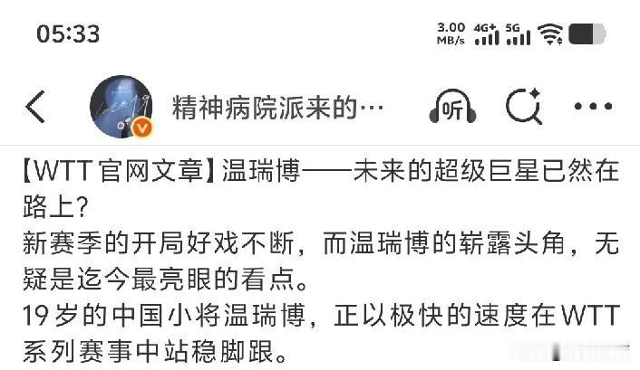 WTT这波捧温瑞博确实有点急了。这两站状态火热是事实,但超级新星的帽子扣得太早。比赛本身有偶然性,想成为真正的顶尖球员,还得看他在冠军赛、大满贯或者升国旗的这些高级别赛事里能不能稳定输出,拿过硬的成绩才行。