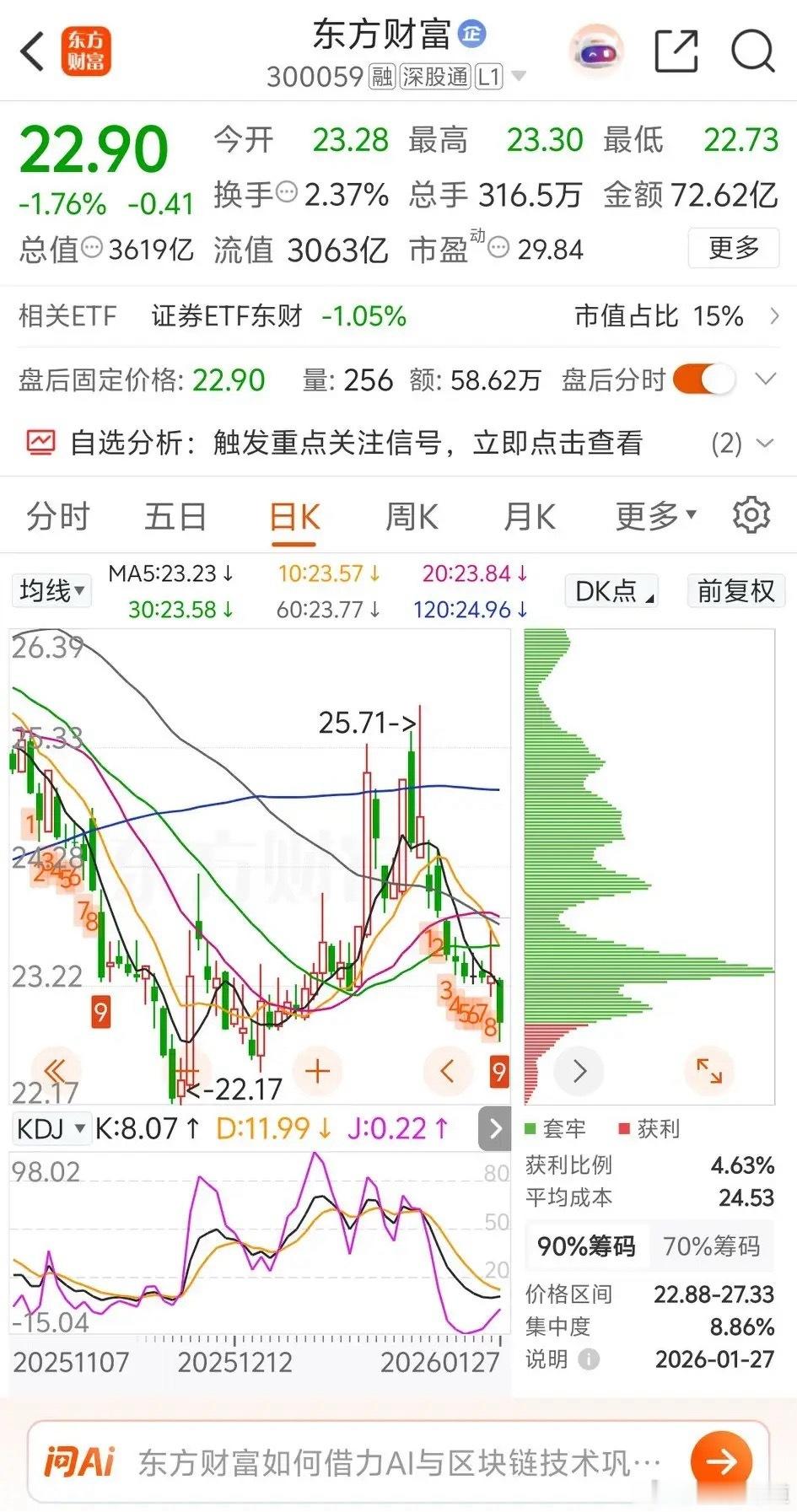 互联网券商龙头东方财富爹够了吗?东方财富网今天的股价表现低迷,实在是上不来台面,再度刷新新年以来的调整低点,盘中触及22.73元。资金流向数据显示,主力资金大幅撤离,净卖出额高达10.8415亿元。早盘时段,东方财富低开后迅速跳水,随后全天大部分时间都在低位维持震荡整理态势。截至收盘,股价下跌1.76%,报收于22.90元。从近期资金流向来看,主力资金出逃迹象明显。近5个交易日中,有4天呈现净卖出状态,累计净卖出金额约22.756亿元。技术走势方面,随着今日的再度杀跌,东方财富日线级别走势已完全破位,年初至今涨幅已转为-1.21%。与之形成对比的是,中信证券今日虽小幅下跌,但已连续两日获主力资金净买入,展现出与东方财富截然不同的资金流向态势。我只在乎什么时候会大涨