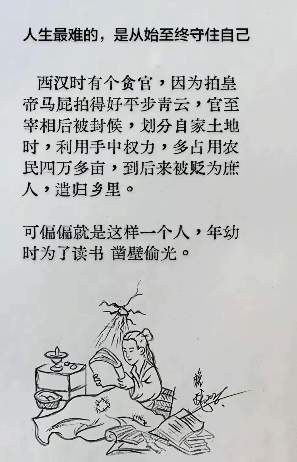从凿壁偷光的励志符号,沦落到贪欲吞噬的人生结局。年少的“奋斗”只是人生的起点,“从始至终守住自己”才是决定人生走向的关键。匡衡的悲剧,在于“起点的励志”没延续为“全程的自律”。求知、奋斗的意义,不止于“改变命运”,更在于“守住底线与本心”。