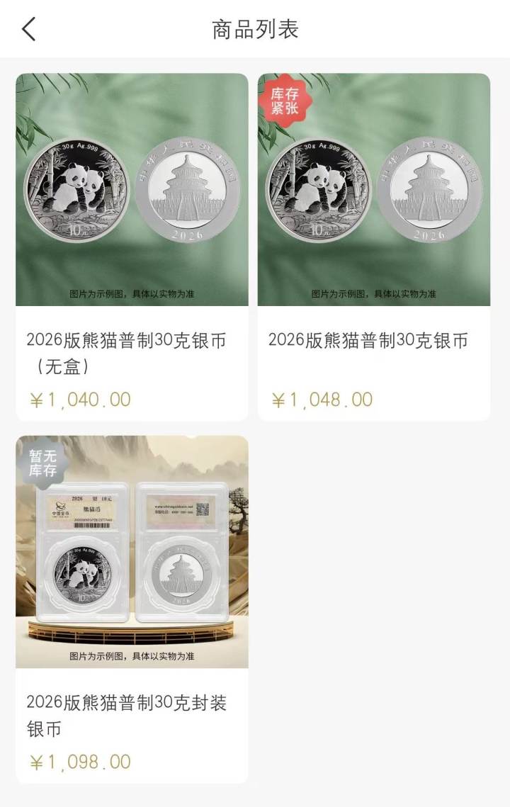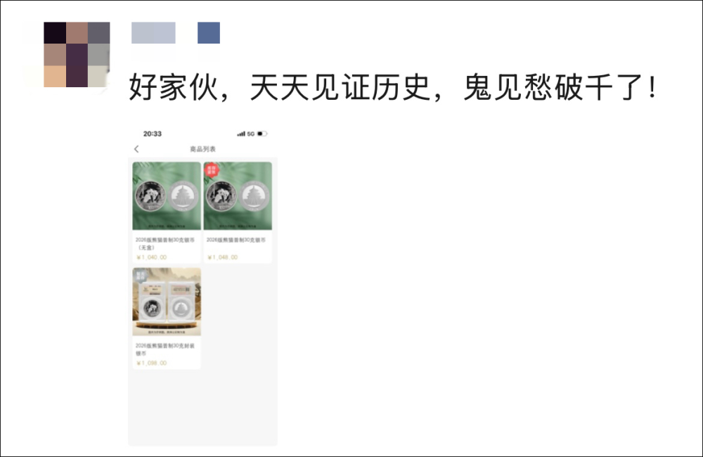 今天,币圈玩家钱先生发了条朋友圈。配图显示,2026版熊猫普制30克银币(无盒)为1040元,带盒的普制币为1048元,封装版涨到了1098元,比两个多月前发行时涨了近130%。