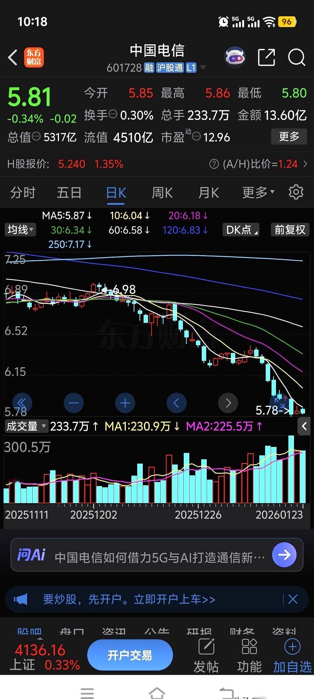 中国电信这只票,简直是上演了一场“围猎”。 上周才暴跌超过5个点,这周一开盘,一群人嗷嗷叫着冲进去抄底,想捡个便宜。K线图刚往上抬头,屏幕上,一笔看不见的巨额卖单,就跟一堵墙似的,直接把股价死死拍了回去。 冲进去的人,钱还没焐热,瞬间被套。 后面几天,那根绿线跟没了骨头似的,一路往下淌,一点反抗的意思都没有。空气里安静得可怕,只有交易软件上数字在变。 好不容易到了周四、周五,眼看K线走了个平底,像踩住了刹车,不少人刚把悬着的心放下一半,盘算着是不是到底了。 结果呢? 同样的剧本,又一笔大单从天而降,毫无征兆,直接把刚稳住的盘面,砸穿了。 这一下,很多人彻底扛不住了。电脑前,鼠标点下去的那一刻,手都在抖,闭着眼,一刀割了下去。 一边是接近5个点的股息率,明晃晃地告诉你这是价值投资;另一边是说来就来的神秘大单,像在冷笑,“水还深着呢”。 这棋,到底该怎么下?