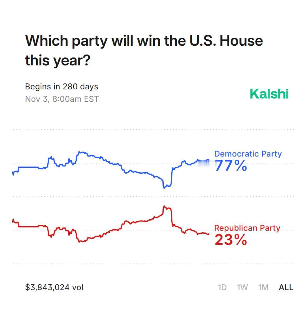 新闻快讯——美国预测市场Kalshi发布数据,民主党今年拿下美国众议院的概率为77%,共和党仅为23%。