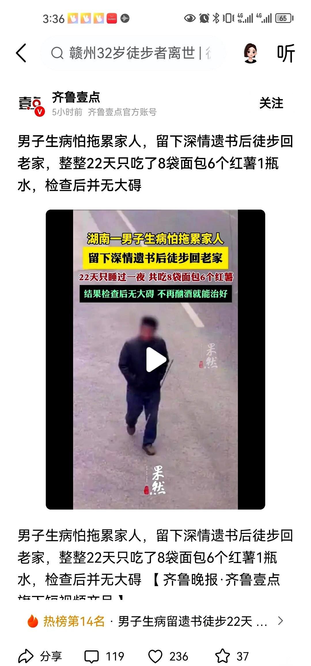 一个男人,拿到了自己的肝病诊断书。 他没把单子给家人看,而是回到家,一个人坐在桌边,把家里这点存款翻来覆去地数。他想到,这笔钱砸进去,可能就是个无底洞,最后人没了,家也垮了。 他拿起笔,开始写信。把这辈子想说没说的话,全写在纸上。写完,叠好,放在桌上。然后,他关上门,转身就走,方向是老家。他决定,不治了,走回去,死在路上,或者死在老屋里。不拖累任何人。 这一走,就是22天。 22天里,城市的高楼在他身后变成一个小点,车流声从喧嚣变得遥远。他唯一的食物,是路上买的6包方便面和6个红薯,饿到极致了,才掰一小块下来,就着一瓶水往下咽。晚上就睡在桥洞下,或者废弃的屋檐里,听着风声,一天天感受着身体的衰败。 他就这么走着,直到整个人瘦到脱相,被路人发现不对劲,送去了医院。 他躺在病床上,闭着眼,心想,终于到头了。 一个医生拿着报告单走进来,啪地一下放在床头柜上。男人睁开眼,准备听最后的宣判。 医生推了推眼镜,看着他,一字一句地说:“我们全面检查过了,你身体……没什么大碍。” 整个病房瞬间安静了,只有仪器发出滴滴的轻响。男人撑着床坐起来,盯着医生,嘴唇动了动,一个字都没说出来。他低头看看自己满是泥垢和血泡的脚,又看看那张干净的报告单。 所以,这事儿就怪了。 是当初的诊断出了天大的乌龙,一张纸差点把一个活人逼上绝路?还是说,这硬扛下来的22天,这场极限的饥饿和徒步,真的能把一个人的身体给“格式化”了?