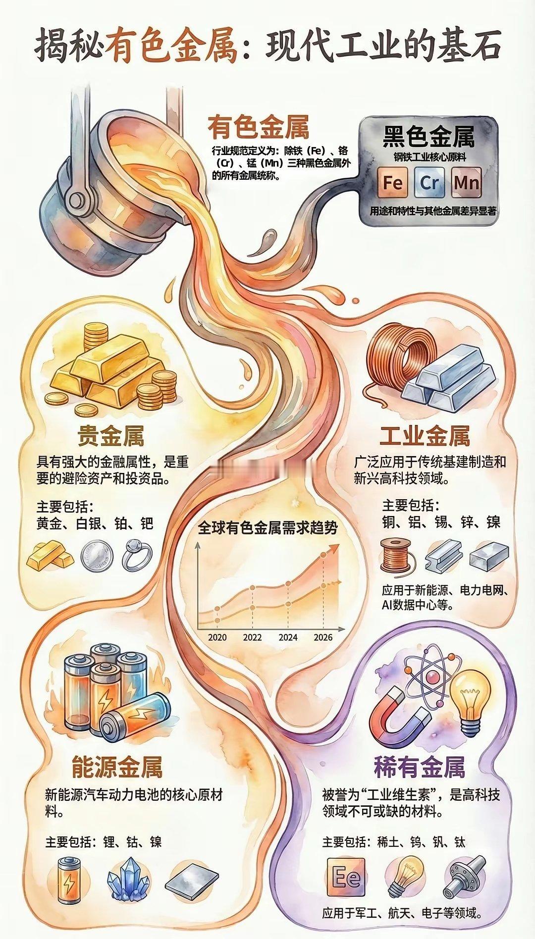有色金属迎历史性大周期!右滑一篇看懂➡️想知道AI、航空航天、机器人等崛起背后,哪些“金属材料”正站上风口?四张图带你看懂“有色金属”!1️⃣ 有色金属“是什么”:按应用属性四大分类• 贵金属:黄金、白银、铂、钯• 工业金属:铜、铝、锡、锌、镍• 能源金属:锂、钴、镍• 稀有金属:稀土、钨、钛、钒等注:镍具有双重身份,工业金属&能源金属2️⃣ 产业链全景:“从矿石到成品”之旅• 上游:挖矿+初炼• 中游:加工+制造• 下游:应用+成品3️⃣ 价格波动背后:三大核心逻辑1. 供给慢:开矿不是“说挖就挖”,周期长2. 需求旺:新能源、AI算力、电网投资等新动能拉动3. 全球化:受全球宏观环境直接影响,波动大4️⃣ 普通人如何关注?三大方向梳理• 电动车、光伏、储能驱动:绿色能源革命• AI数据中心、机器人、航空航天驱动:科技与高端制造• 电网投资、地产复苏、避险情绪驱动:传统基石与避险⚠️仅做信息搜集与整理,不代表推荐有色金属 有色 黄金 工业有色 金融知识 贵金属 化工