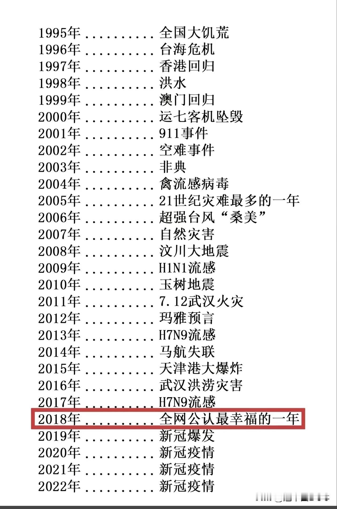 为啥都说2018年是最近30年最幸福的一年?看看下文你就懂了。 往前数,不是洪水地震就是病毒空难,几乎年年揪心。2003年非典、2008年汶川、2015年天津港爆炸…光看文字都心头一紧。往后看,2019年起疫情笼罩全球,一罩就是三年。 唯独2018年,红框框里写着“全网公认最幸福的一年”。那一年没特大天灾,没席卷全球的疫情,经济稳中有升,外卖还能送到家门口,周末能约朋友逛街看电影。手机里的新闻,少了些生死沉重,多了些生活烟火。 幸福就怕对比。经历过风浪,才懂平凡的珍贵。2018年的好,恰恰是前后那些“不容易”衬出来的——它像夹在苦难史里的一页暖黄纸,写着普普通通却让人怀念的小日子。 如今回头看才明白:原来不用戴口罩、能自由呼吸、家人平安相聚的每一年,都是黄金时代。